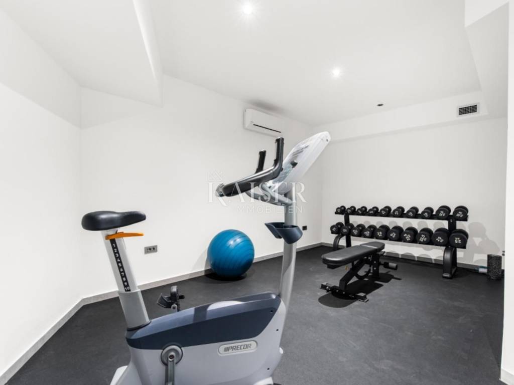 In the basement of the villa there is a recreation and relaxation area: a gym, a wellness area and a toilet, an ideal place for an active lifestyle and relaxation after a long day.