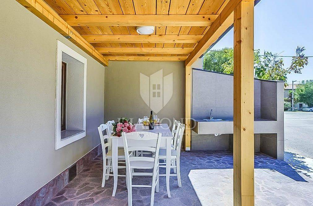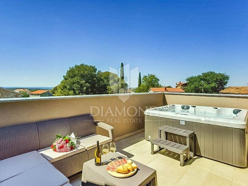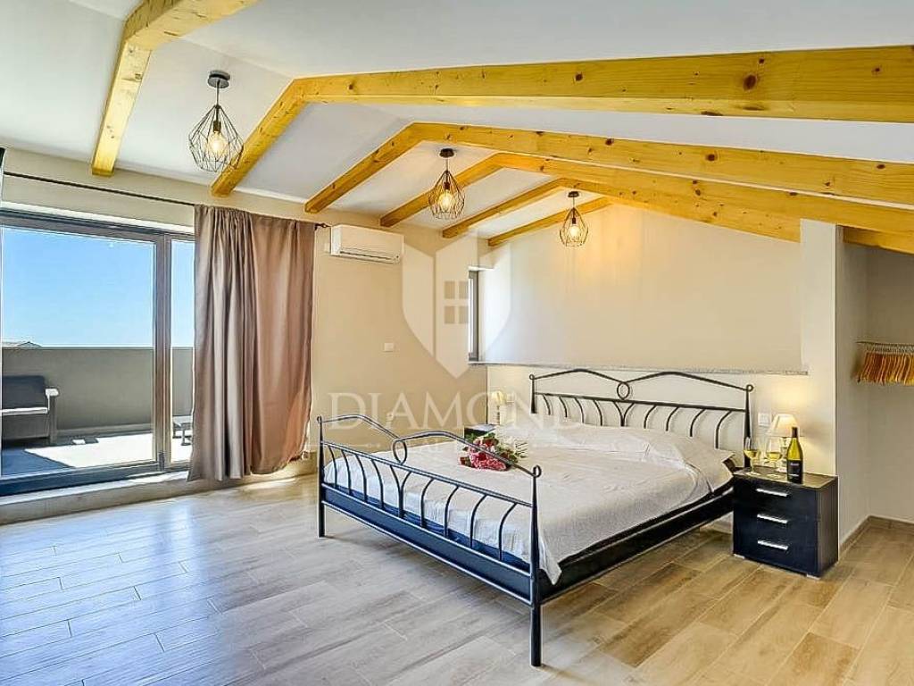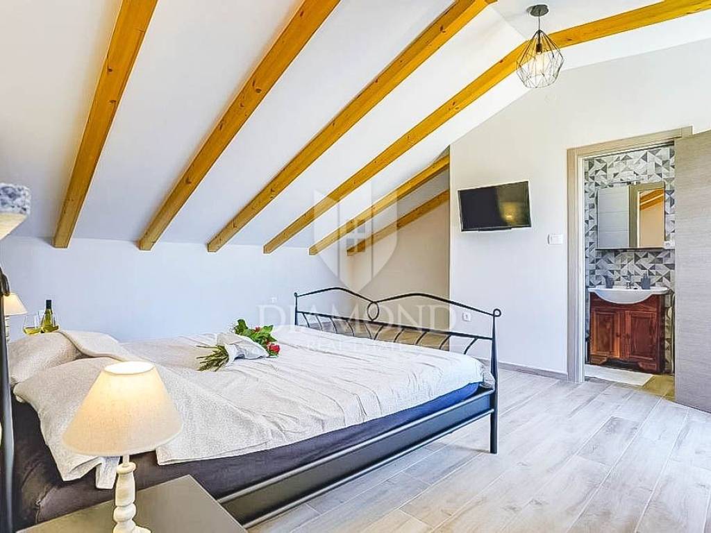 This beautiful renovated terraced house in the immediate vicinity of the city of Poreč offers an extraordinary opportunity for a comfortable life or a tourist rental. With a view of the sea and a distance of only 6 km from Poreč, this is an ideal place for those who are looking for a peaceful oasis, and at the same time want to be close to all necessary facilities. The house covers 162 square meters and spans three floors. On the ground floor of the house there is a rustically decorated kitchen with a dining room, a spacious living room and a bathroom. An elegant staircase leads to the second floor, where there are two bedrooms, each with its own bathroom. One of the bedrooms has access to a terrace with a beautiful view of the sea. The third floor is reserved for relaxation and luxury, with a spacious bedroom, a bathroom equipped with a sauna and a part of the covered terrace with a jacuzzi, perfect for enjoying with a beautiful view of the sea. The house is categorized for rent and is sold fully furnished and equipped with high quality furniture. Air conditioners installed throughout the house are used for heating and cooling. In front of the house there is a covered terrace with a summer kitchen, ideal for outdoor meals. Opposite the house is an additional space currently used as a parking lot, but it can be adapted according to the wishes of the future owners, creating additional opportunities to enjoy the outdoors. Given its outstanding location and facilities, this property is perfect for family living or as a tourist rental investment.