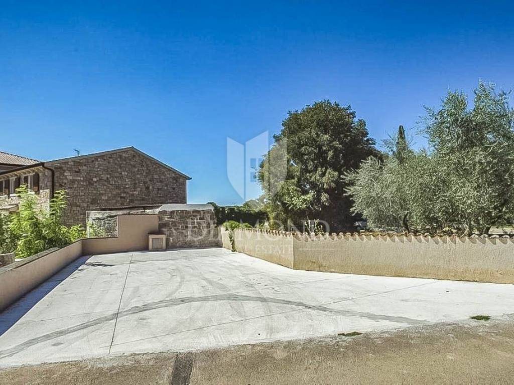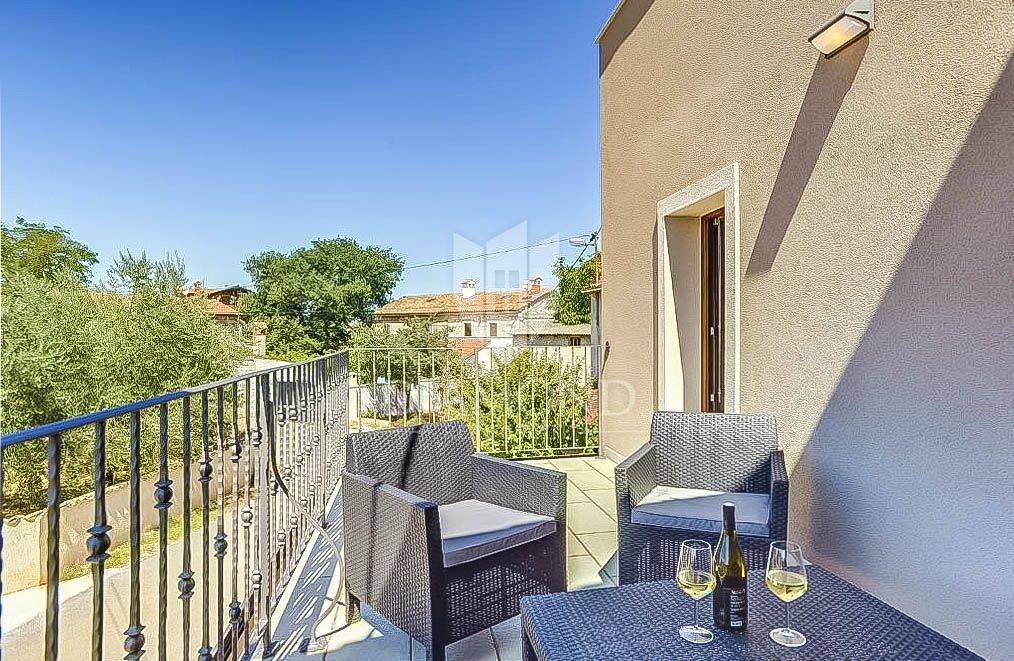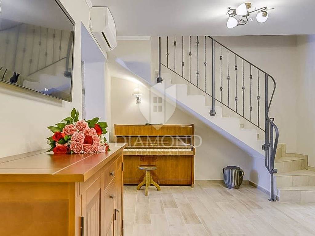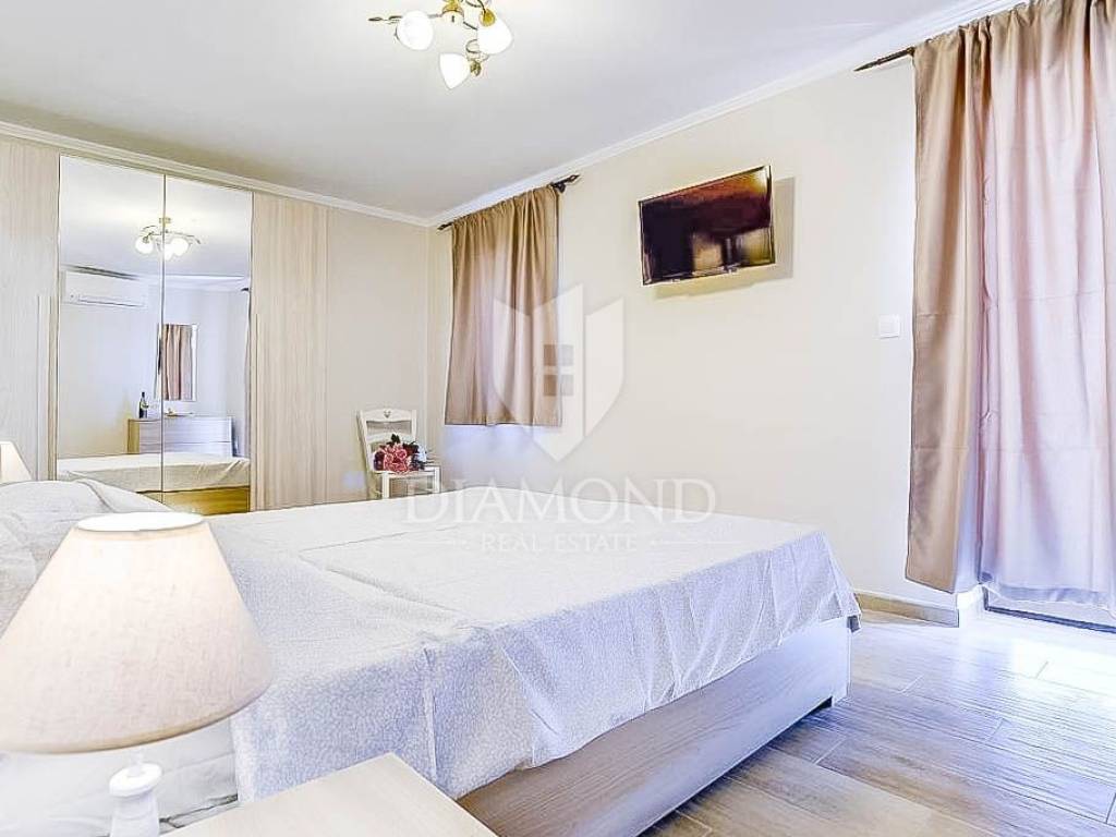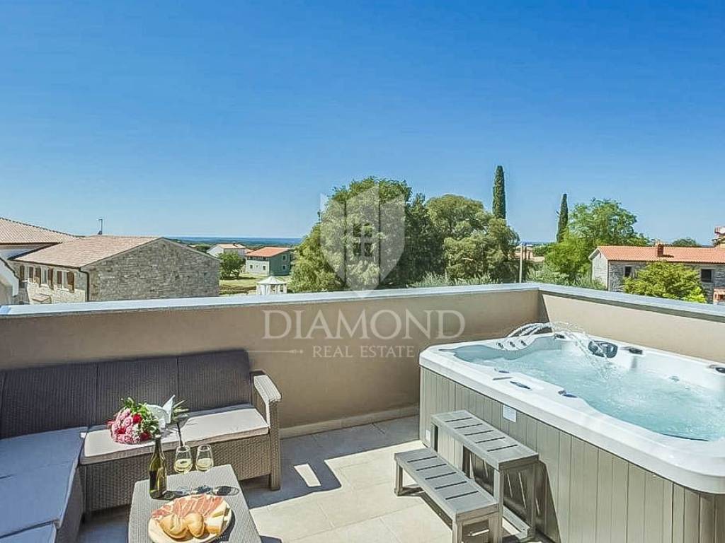 This beautiful renovated terraced house in the immediate vicinity of the city of Poreč offers an extraordinary opportunity for a comfortable life or a tourist rental. With a view of the sea and a distance of only 6 km from Poreč, this is an ideal place for those who are looking for a peaceful oasis, and at the same time want to be close to all necessary facilities. The house covers 162 square meters and spans three floors. On the ground floor of the house there is a rustically decorated kitchen with a dining room, a spacious living room and a bathroom. An elegant staircase leads to the second floor, where there are two bedrooms, each with its own bathroom. One of the bedrooms has access to a terrace with a beautiful view of the sea. The third floor is reserved for relaxation and luxury, with a spacious bedroom, a bathroom equipped with a sauna and a part of the covered terrace with a jacuzzi, perfect for enjoying with a beautiful view of the sea. The house is categorized for rent and is sold fully furnished and equipped with high quality furniture. Air conditioners installed throughout the house are used for heating and cooling. In front of the house there is a covered terrace with a summer kitchen, ideal for outdoor meals. Opposite the house is an additional space currently used as a parking lot, but it can be adapted according to the wishes of the future owners, creating additional opportunities to enjoy the outdoors. Given its outstanding location and facilities, this property is perfect for family living or as a tourist rental investment.