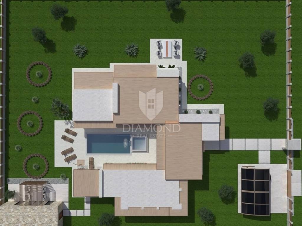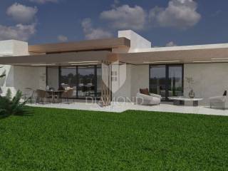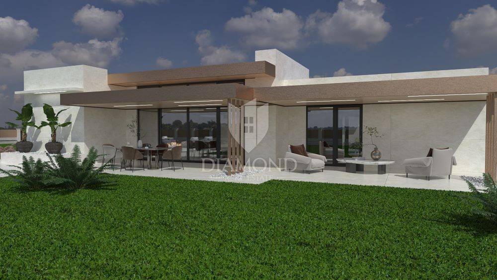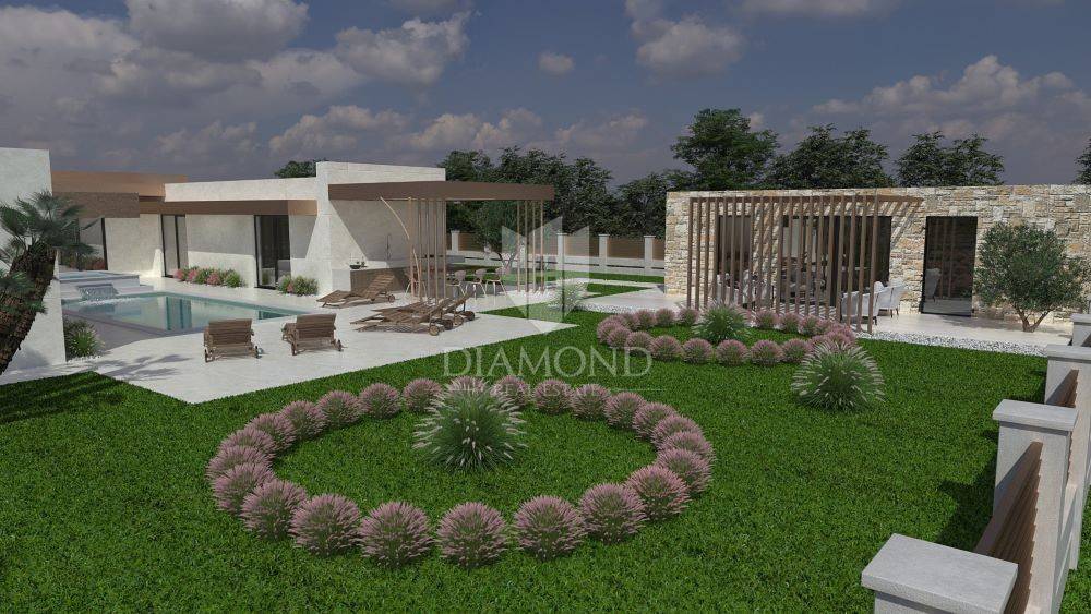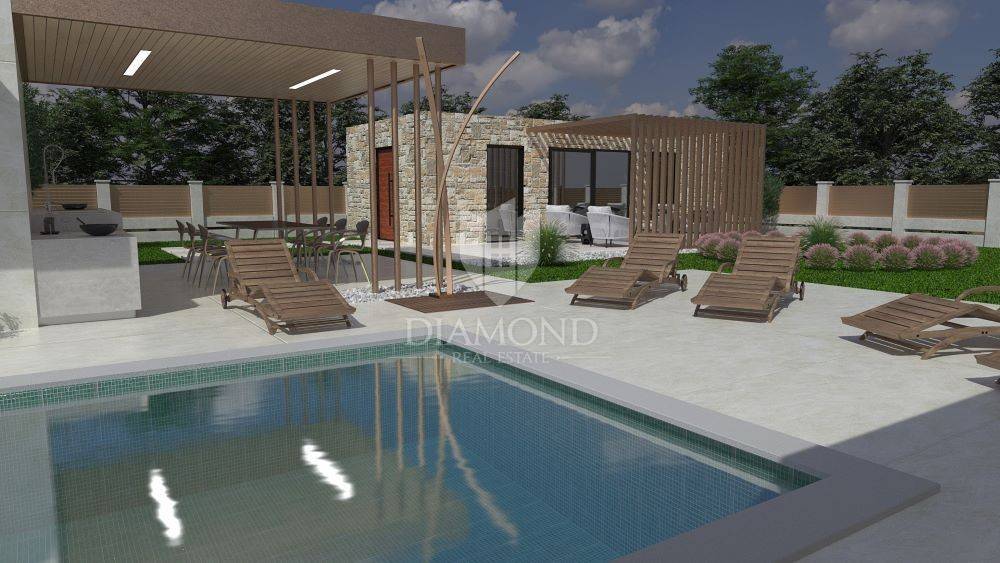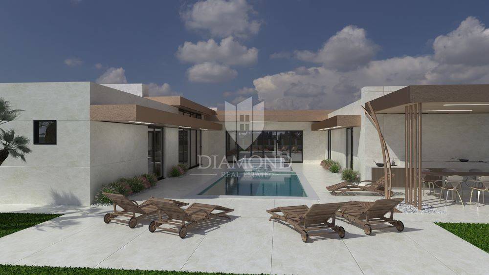 Ližnjan, Istria We present to you this beautiful one-story house with a swimming pool, which has been designed down to the smallest details in the exterior and interior. This one-story house will be located on a plot of approx. 760 m2, and its living area will be 201.13 m2. The house itself will have three bedrooms with their own bathrooms and the house is being sold fully furnished with all furniture and equipment. Large stone slabs will lead to the large entrance door made of solid wood. The first room upon entering the house will consist of a large hallway in which there will be a sofa set with wine shelves. To the left, through the corridor, which will be illuminated by large glass walls, you will reach the first two bedrooms of 16 m2 with their own bathroom and dressing room. Next to the entrance, a small corridor leads to the guest toilet and the boiler room, where the washing machine and dryer, boiler and other appliances will be located. In the continuation of the entrance hall, on the right side, you will reach the main open space living room of 55 m2, which will have access to the pool and a covered terrace with seating and a gas fireplace for evening enjoyment, which will house a modern kitchen with its own island. There will be a pantry next to the kitchen, and down the living room through a hidden door you will enter the master bedroom, which will have an area of 20 m2 + a bathroom and a walk-in wardrobe. One of the unique features of this one-story house is certainly the outdoor pool with jacuzzi, all rooms in the house as well as the bedrooms will have a view and access to the pool, which will be located in the middle of the building, due to the design of the space. The pool will be 800×400 with a jacuzzi that will have two benches with hydromassage. There will be enough space on the sunbathing area to accommodate deckchairs and a shower. A summer kitchen with a grill, a pizza oven and a large table will be located right next to the pool. It will also be possible to reach the auxiliary building from the summer kitchen, which will serve as a tavern made of Istrian hewn stone and old oak beams, the tavern will have an exit to a covered terrace with seating furniture. The facility will have two covered parking spaces. The construction of the house starts as soon as you decide to buy it.
