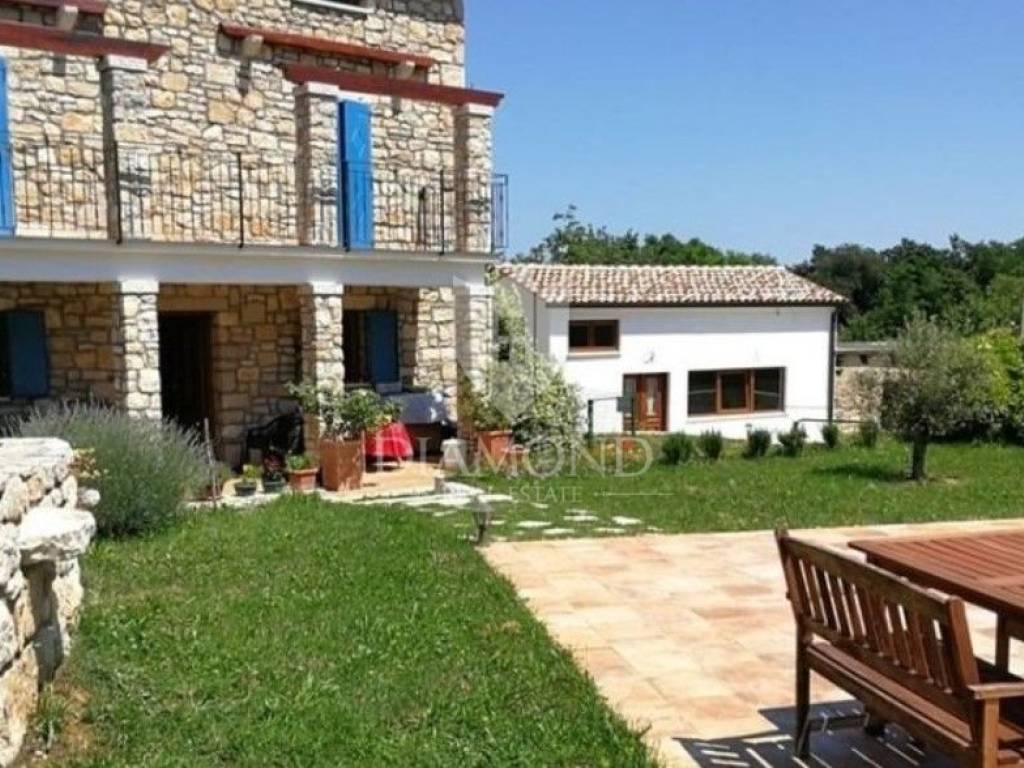 This enchanting stone house of traditional Istrian style is located in the beautiful surroundings of Labin, a small town only 5 kilometers from the sea. The house, which covers an area of 260 m², is spread over three floors. On the ground floor there is a modern kitchen with a dining room, a spacious living room and a bathroom. Stairs lead to the first floor, where there are two comfortable bedrooms, each with its own bathroom. At the top of the house is a mansard with another bedroom and bathroom, and each room has access to the terrace. The interior of the house is decorated with high quality antique furniture. Gas central heating provides warmth during the cold months, while air conditioning provides comfort in the summer. For lovers of the atmosphere by the fire, there is a large fireplace in the living room. The spacious garden of 3700 m² offers a swimming pool, a garage and an additional studio apartment of 70 m², ideal for guests or as a workspace. This house is perfect for anyone who appreciates Istrian charm, natural materials such as stone and a peaceful environment on their own property.