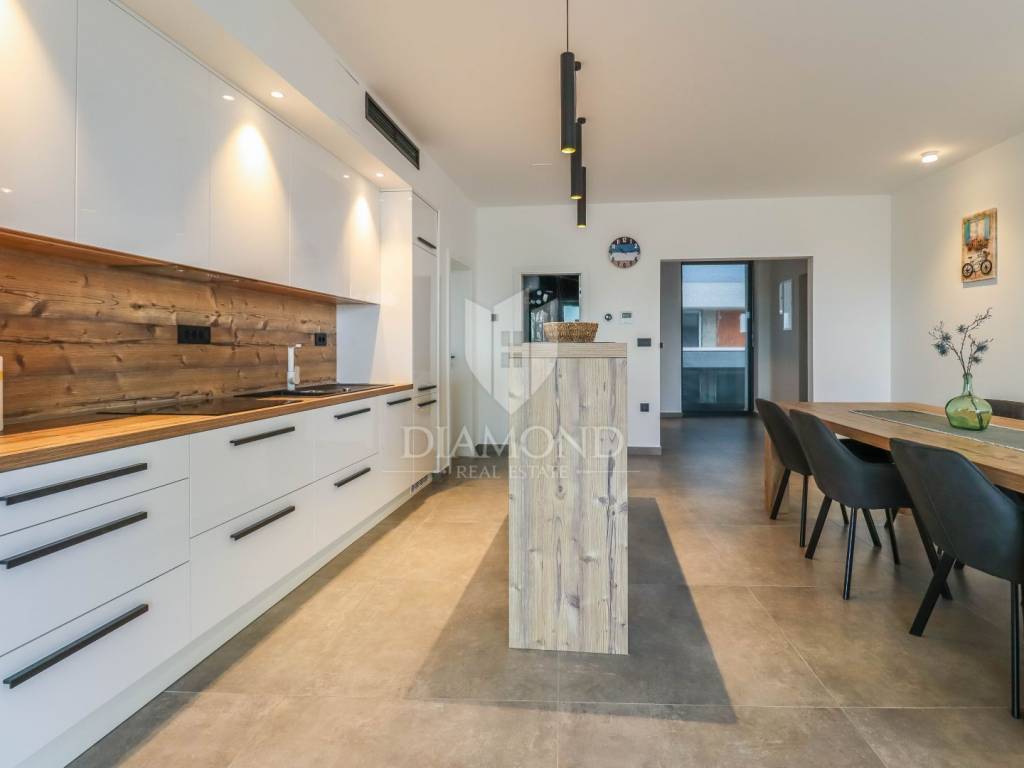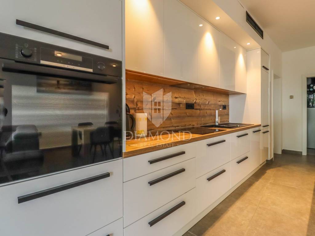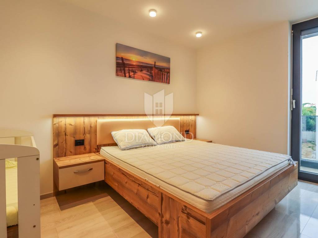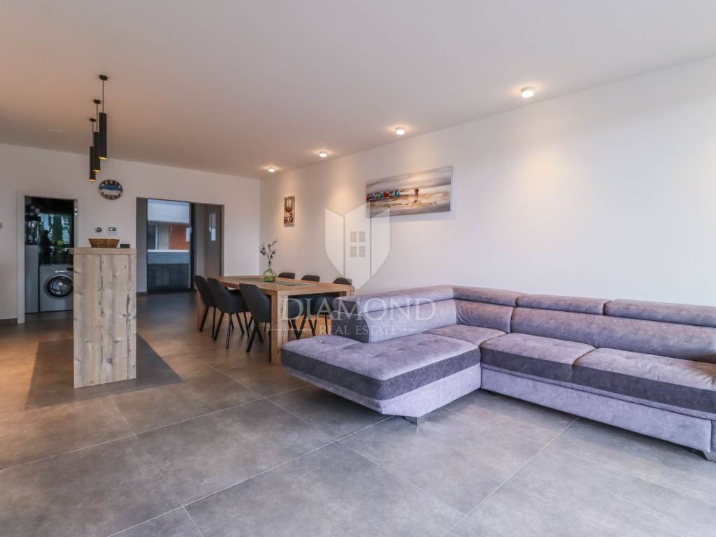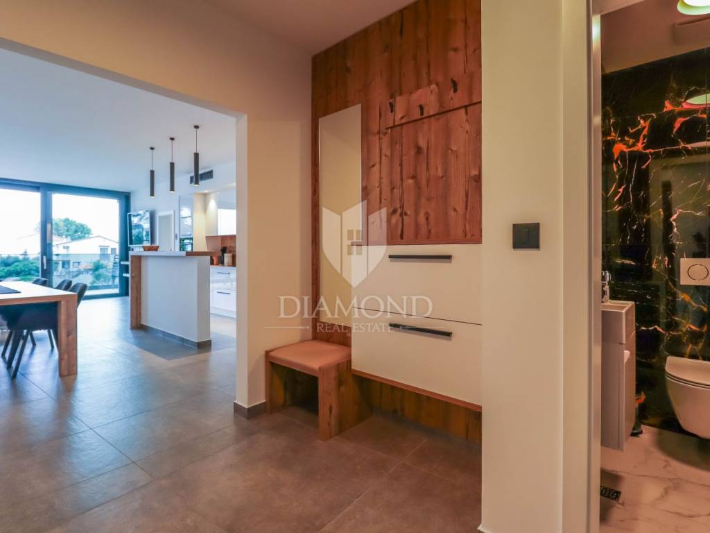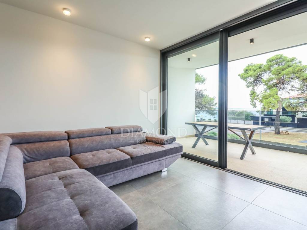 A luxury apartment is for sale in Fažana, located only 80 meters from the coast, with an enchanting view of the sea. The apartment is located in a two-story building of top quality and design, surrounded by a fenced yard with paved parking spaces. Each apartment has its own parking space and a storage room of about 6 m². The building is equipped with the highest quality aluminum carpentry with electric blinds and mosquito nets, as well as security doors. The apartments have underfloor heating and cooling through a heat pump, which ensures comfort throughout the year. The apartment for sale covers an area of 120 m² and is located on the first floor. It contains a spacious living room with dining room and kitchen, two bedrooms with private bathrooms and an additional toilet. The living room opens onto a covered terrace with an unobstructed view of the sea. The seller is a legal entity, which means that the buyer does not pay real estate sales tax, because VAT is already included in the price.