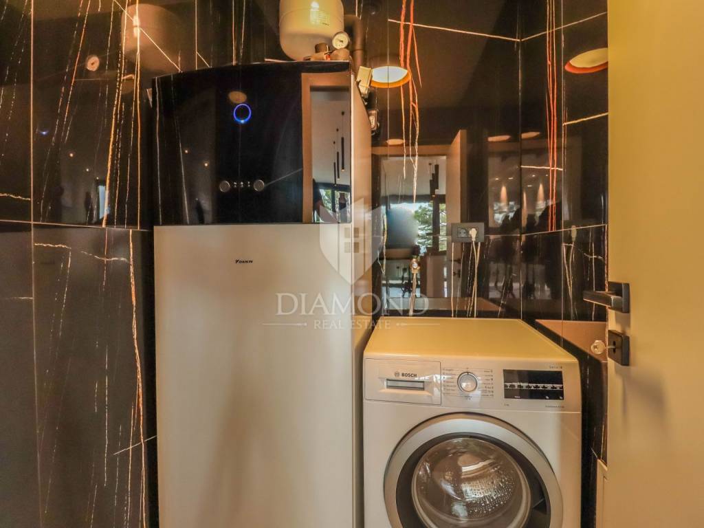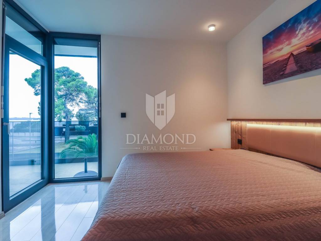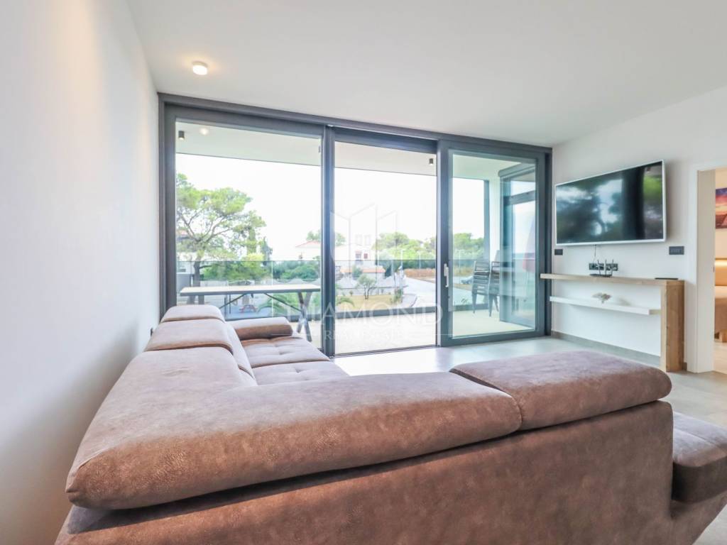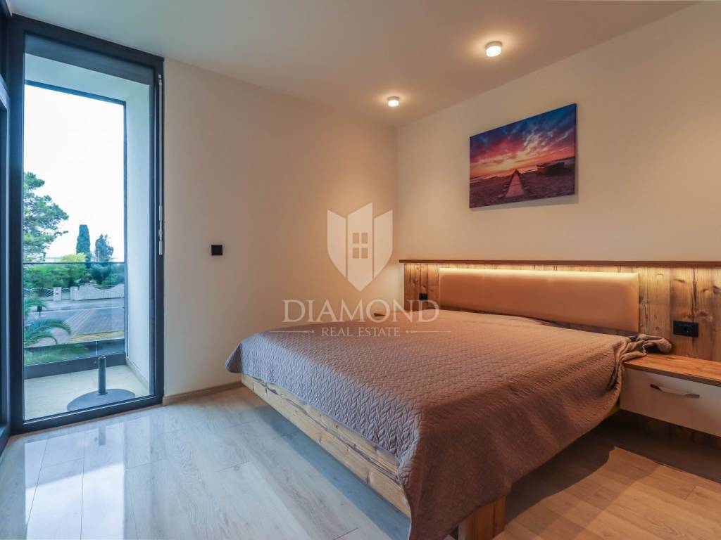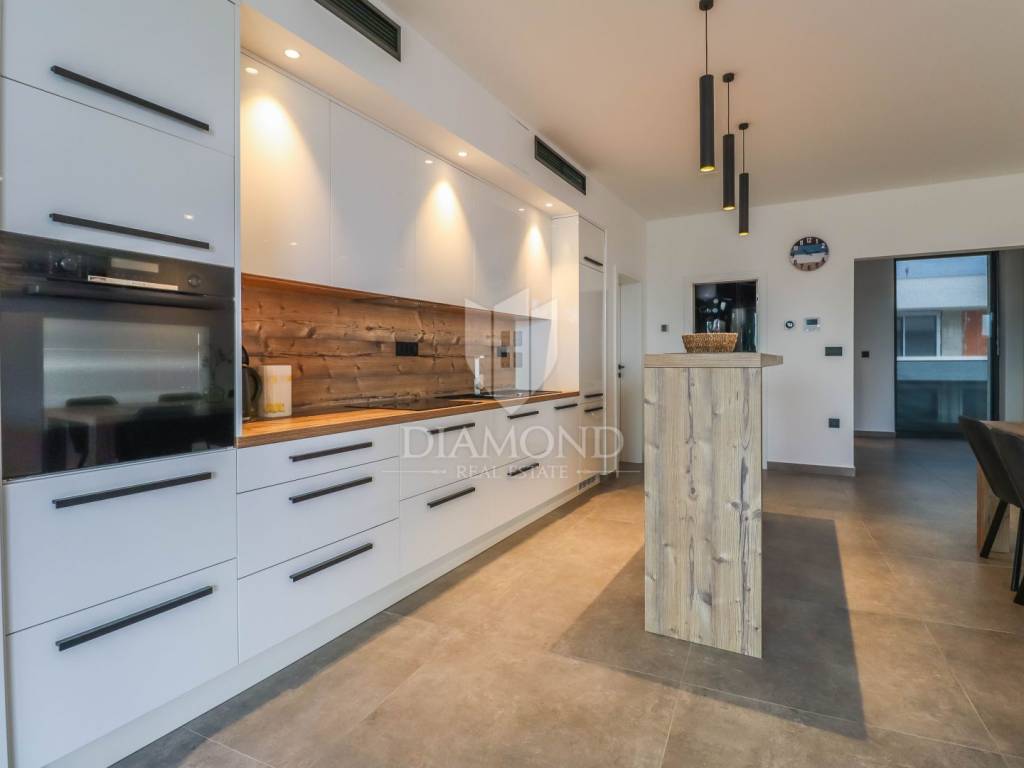 A luxury apartment is for sale in Fažana, located only 80 meters from the coast, with an enchanting view of the sea. The apartment is located in a two-story building of top quality and design, surrounded by a fenced yard with paved parking spaces. Each apartment has its own parking space and a storage room of about 6 m². The building is equipped with the highest quality aluminum carpentry with electric blinds and mosquito nets, as well as security doors. The apartments have underfloor heating and cooling through a heat pump, which ensures comfort throughout the year. The apartment for sale covers an area of 120 m² and is located on the first floor. It contains a spacious living room with dining room and kitchen, two bedrooms with private bathrooms and an additional toilet. The living room opens onto a covered terrace with an unobstructed view of the sea. The seller is a legal entity, which means that the buyer does not pay real estate sales tax, because VAT is already included in the price.