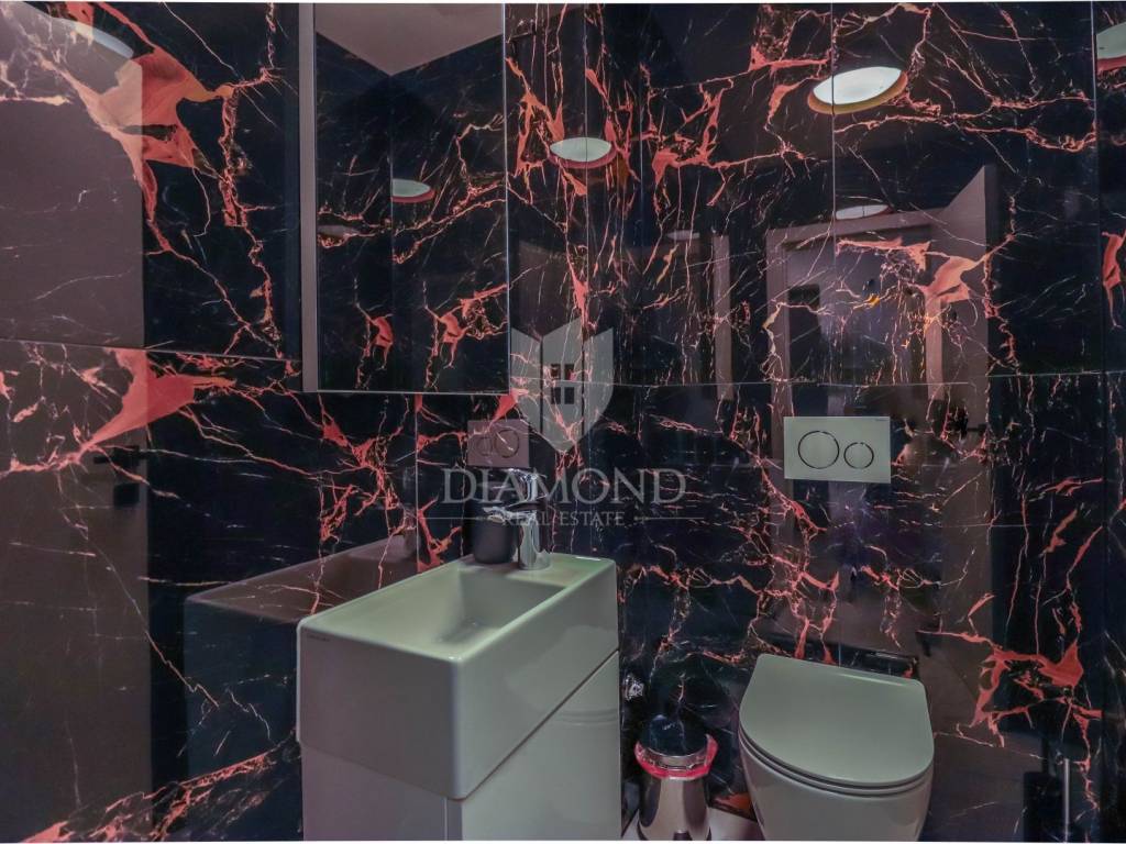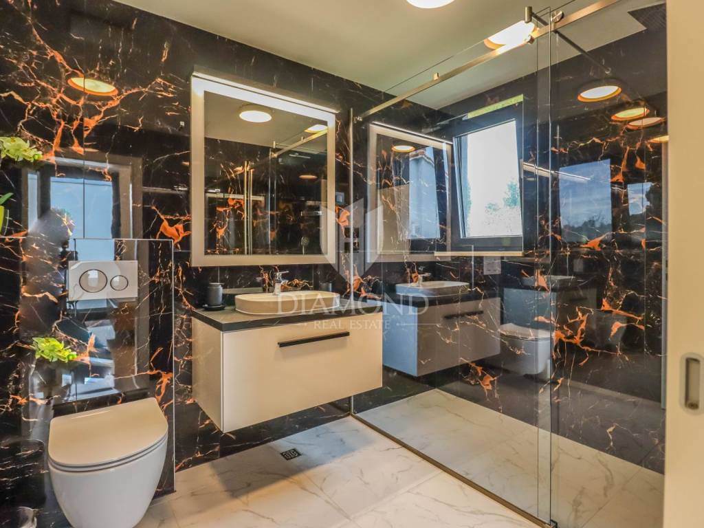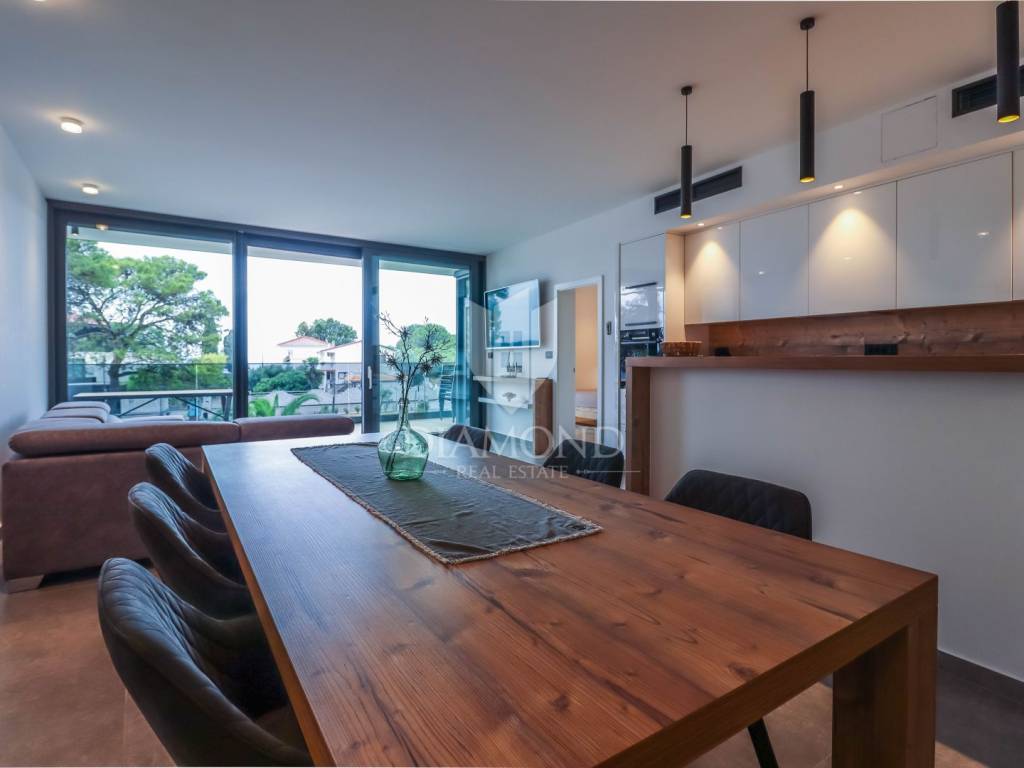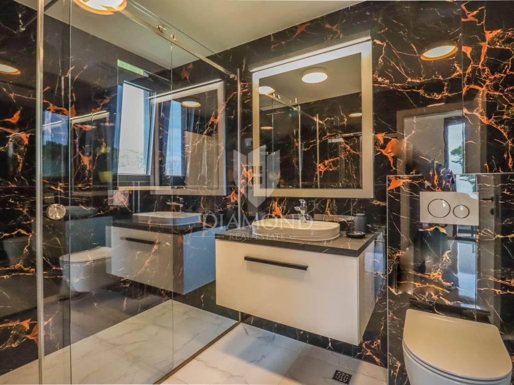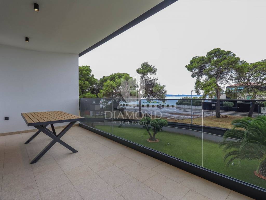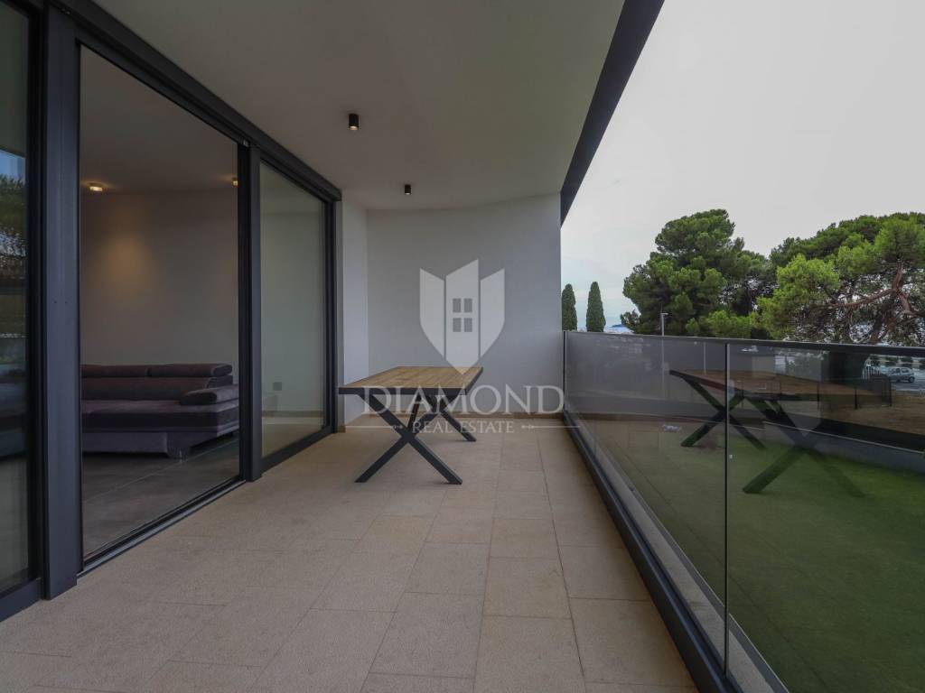 A luxury apartment is for sale in Fažana, located only 80 meters from the coast, with an enchanting view of the sea. The apartment is located in a two-story building of top quality and design, surrounded by a fenced yard with paved parking spaces. Each apartment has its own parking space and a storage room of about 6 m². The building is equipped with the highest quality aluminum carpentry with electric blinds and mosquito nets, as well as security doors. The apartments have underfloor heating and cooling through a heat pump, which ensures comfort throughout the year. The apartment for sale covers an area of 120 m² and is located on the first floor. It contains a spacious living room with dining room and kitchen, two bedrooms with private bathrooms and an additional toilet. The living room opens onto a covered terrace with an unobstructed view of the sea. The seller is a legal entity, which means that the buyer does not pay real estate sales tax, because VAT is already included in the price.