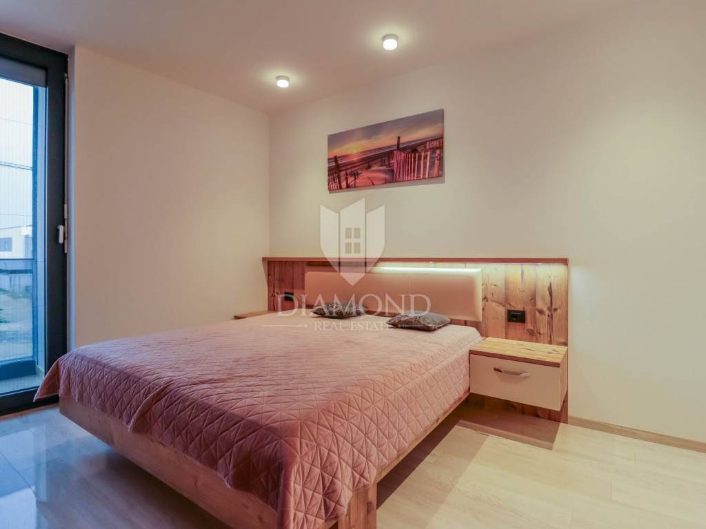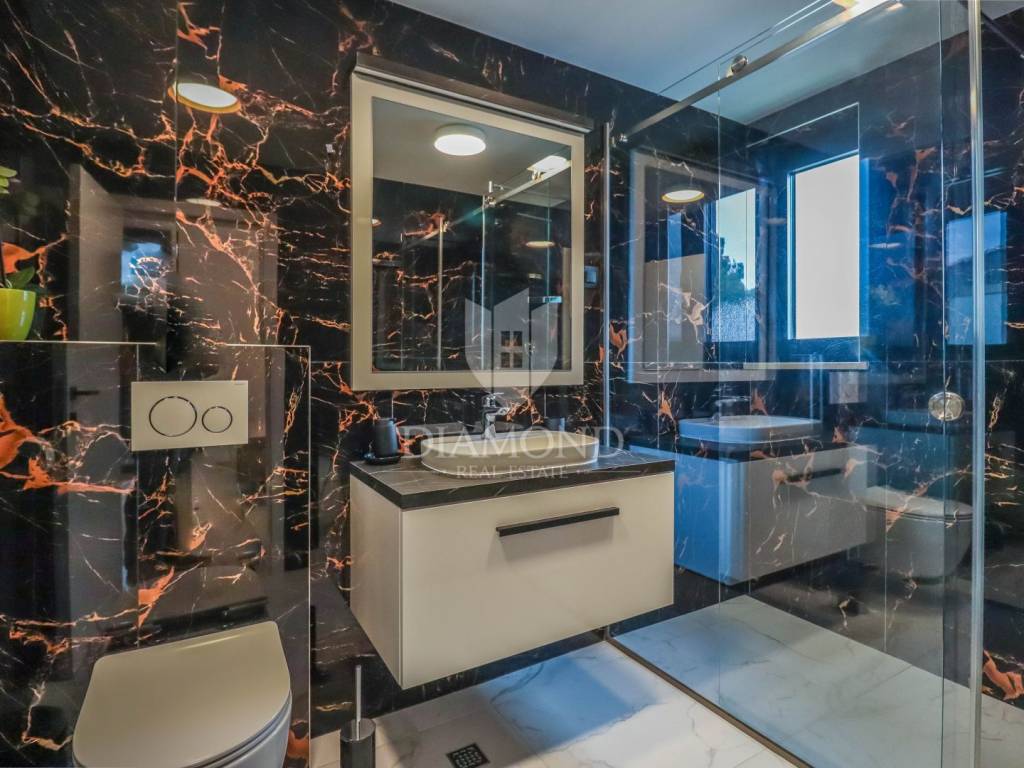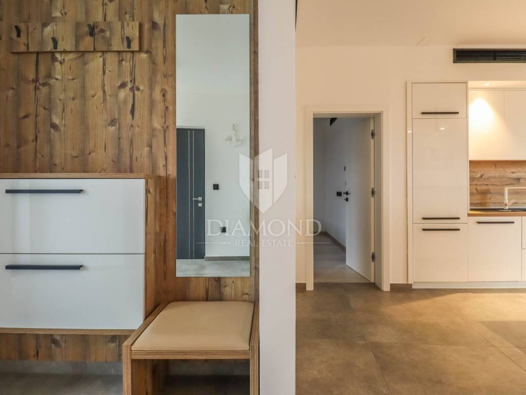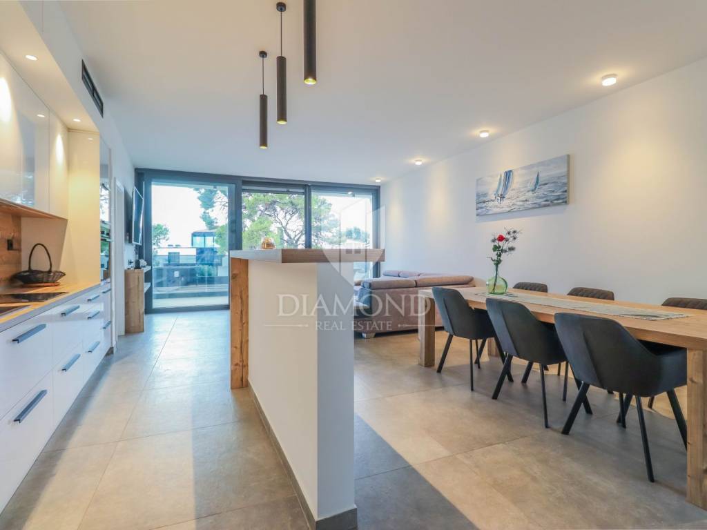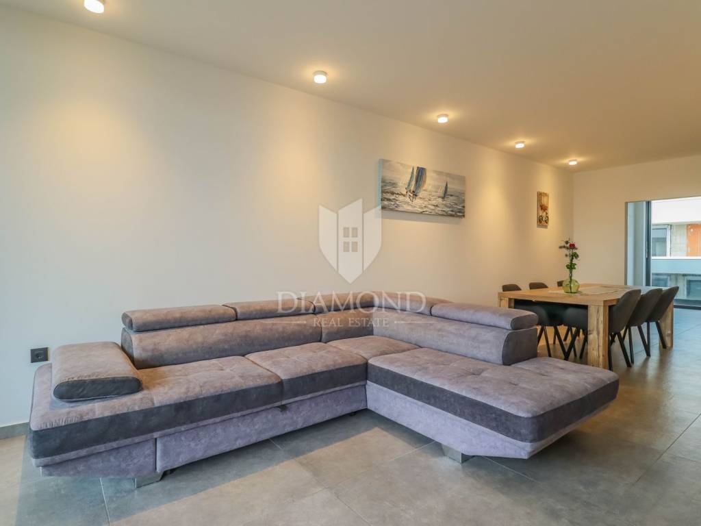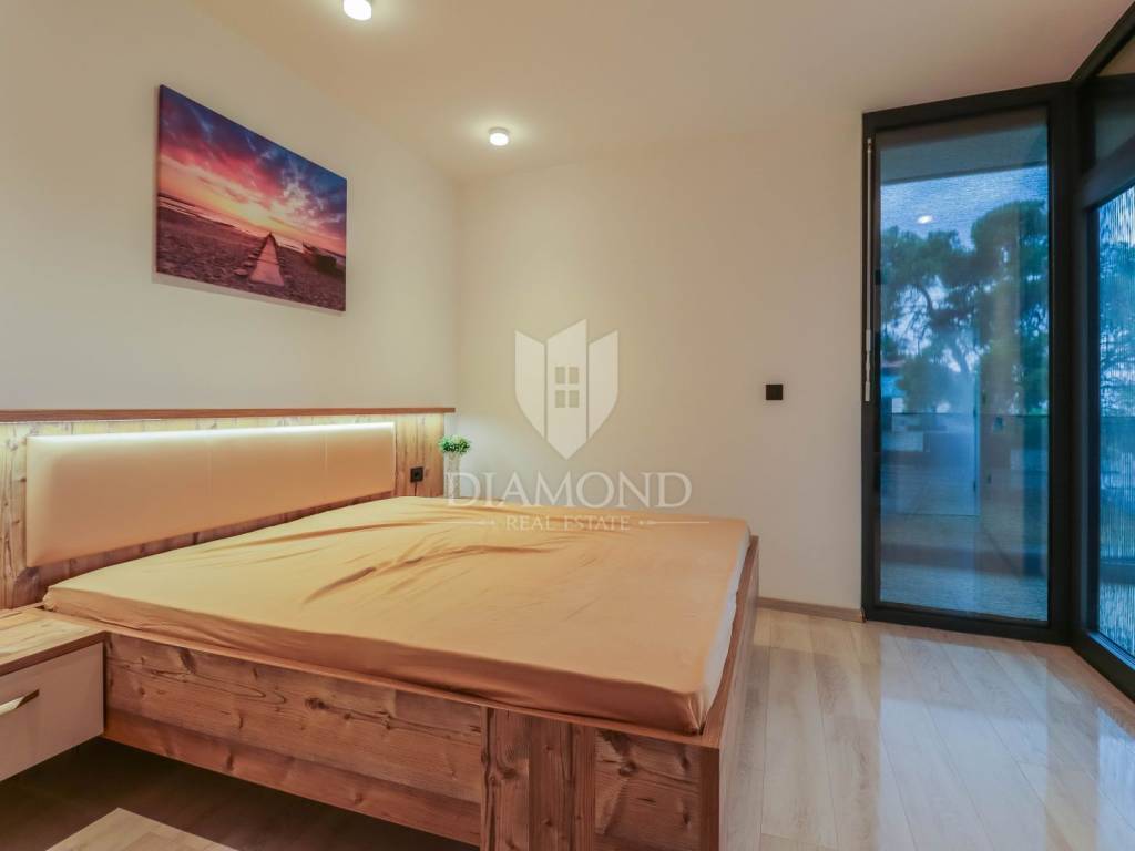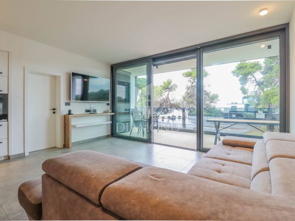 Fažana, Istria For sale is a luxurious apartment, only 80 meters from the beach, with an enchanting view of the sea. The apartment is located in a two-story residential building of top quality and design, surrounded by a fenced yard with paved parking spaces. Each apartment has its own parking space and a storage area of about 6 m². The building is equipped with the highest quality aluminum carpentry with electric blinds and mosquito nets and security doors. The apartments are equipped with underfloor heating and heating and cooling via a heat pump, which provides comfort throughout the year. The apartment for sale is located on the first floor and covers an area of 120 m². It consists of a spacious living room with dining room and kitchen, two bedrooms with private bathrooms and an additional toilet. The living room opens onto a covered terrace with an unobstructed view of the sea. The seller is a legal entity, therefore the buyer does not pay real estate sales tax, but VAT is included in the price.