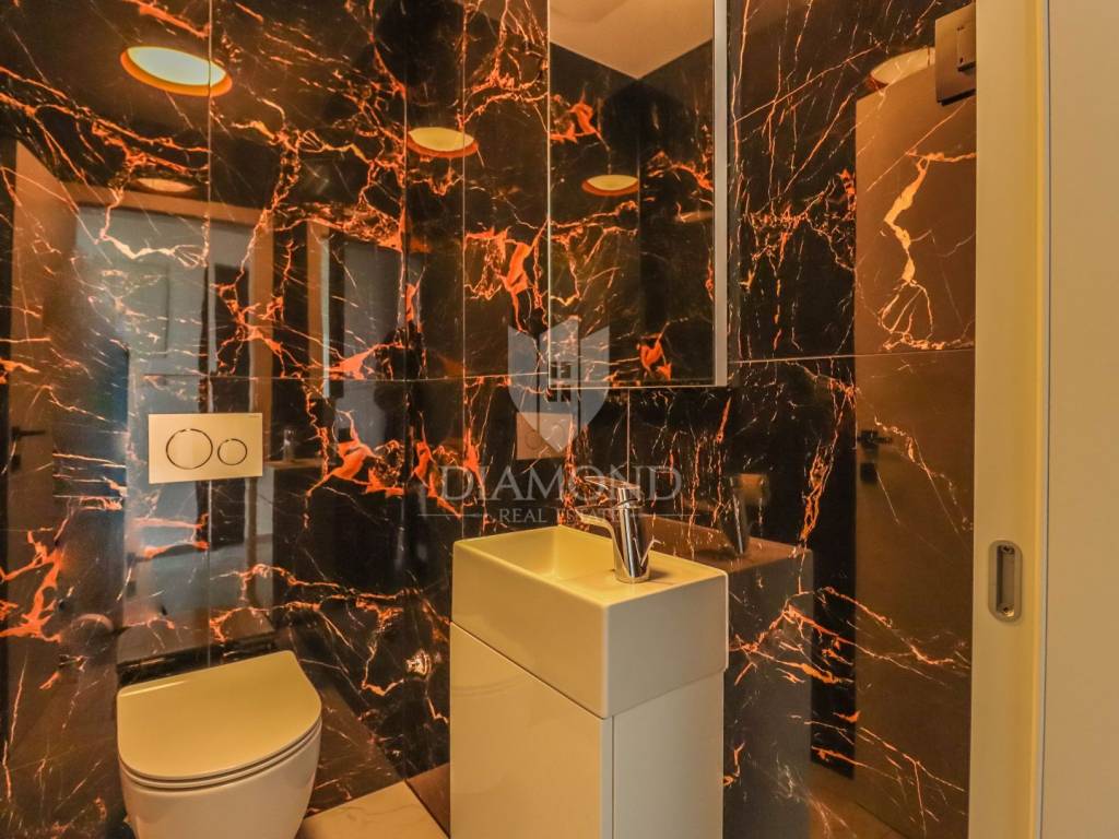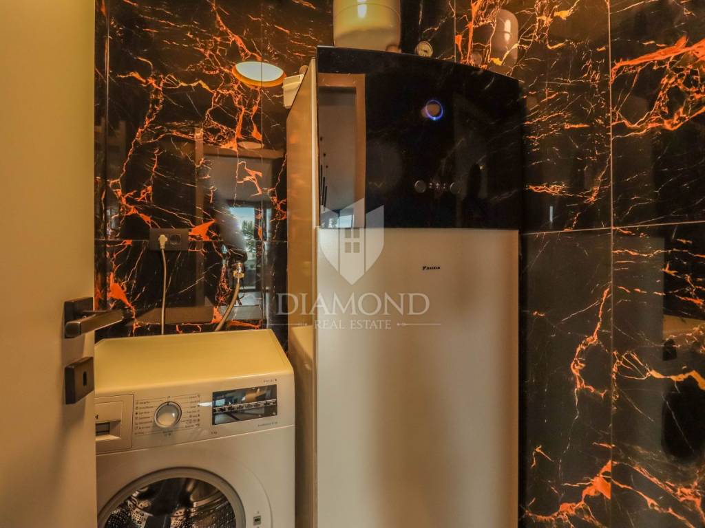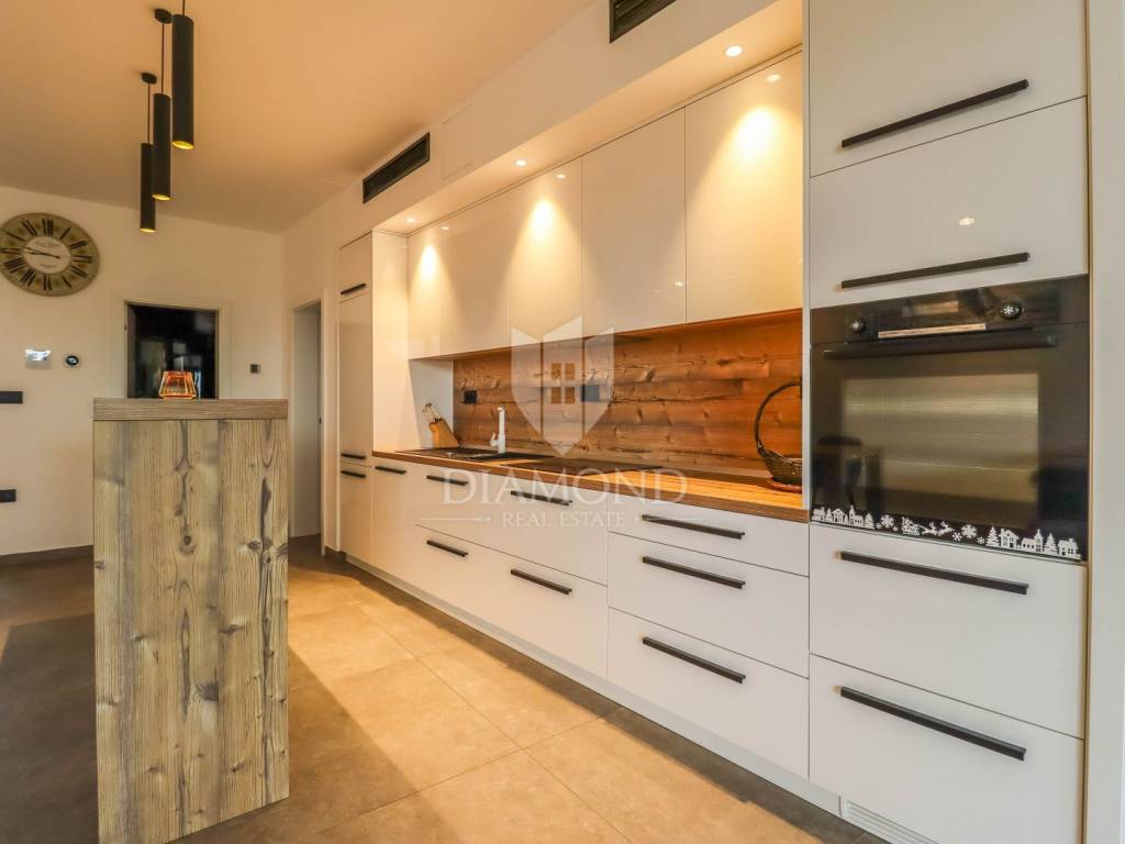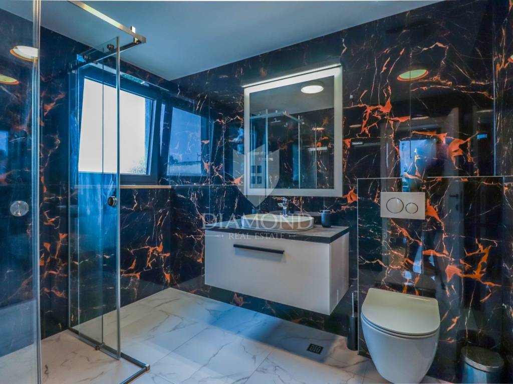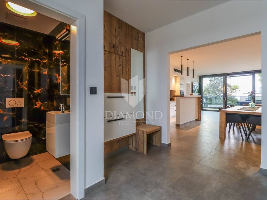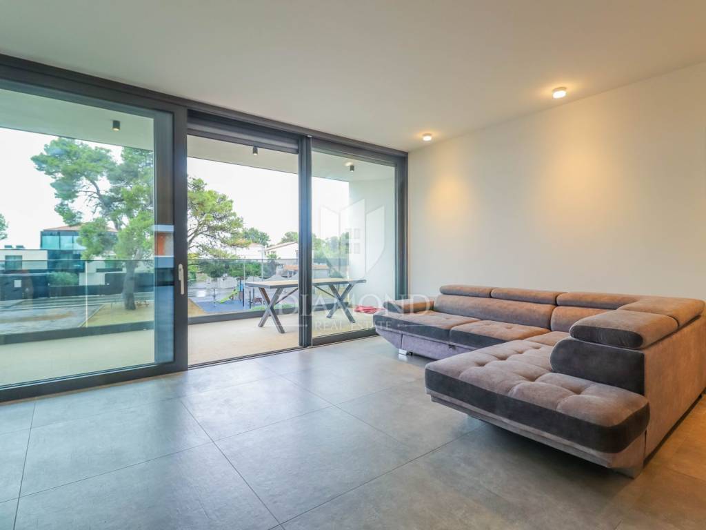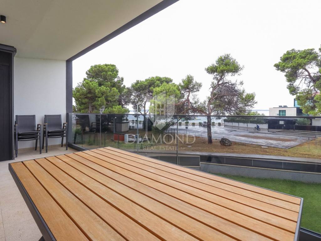 Fažana, Istria For sale is a luxurious apartment, only 80 meters from the beach, with an enchanting view of the sea. The apartment is located in a two-story residential building of top quality and design, surrounded by a fenced yard with paved parking spaces. Each apartment has its own parking space and a storage area of about 6 m². The building is equipped with the highest quality aluminum carpentry with electric blinds and mosquito nets and security doors. The apartments are equipped with underfloor heating and heating and cooling via a heat pump, which provides comfort throughout the year. The apartment for sale is located on the first floor and covers an area of 120 m². It consists of a spacious living room with dining room and kitchen, two bedrooms with private bathrooms and an additional toilet. The living room opens onto a covered terrace with an unobstructed view of the sea. The seller is a legal entity, therefore the buyer does not pay real estate sales tax, but VAT is included in the price.