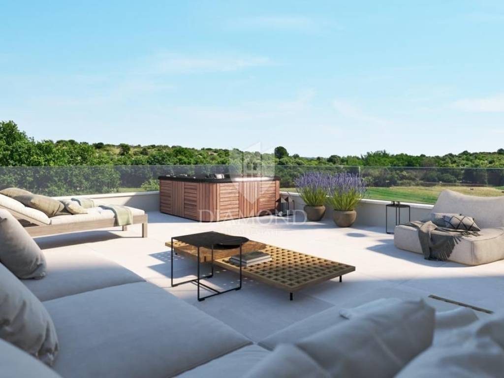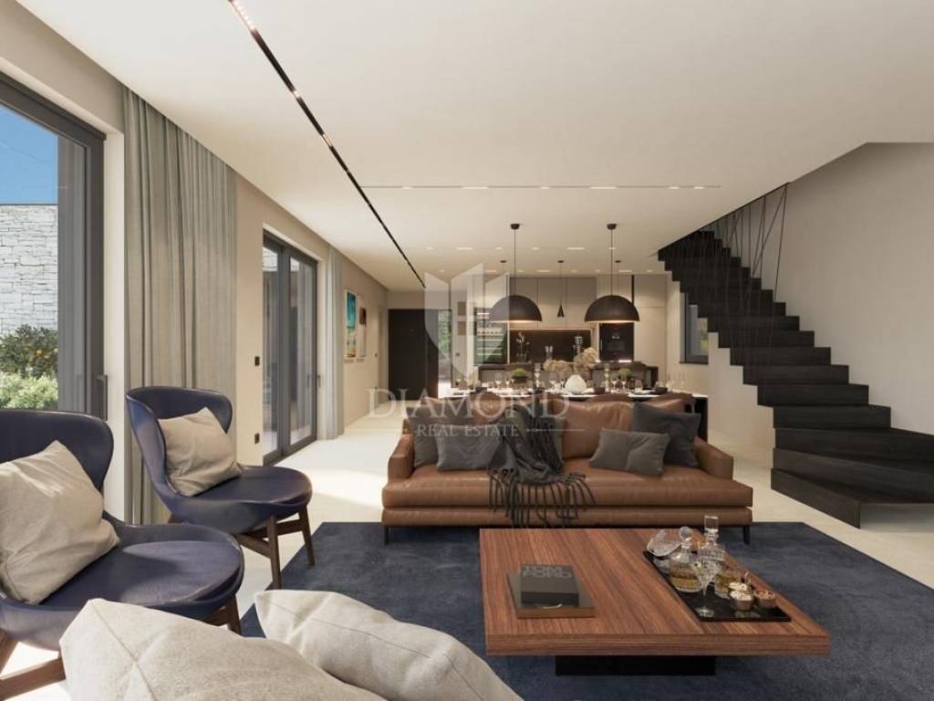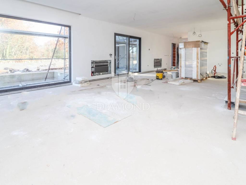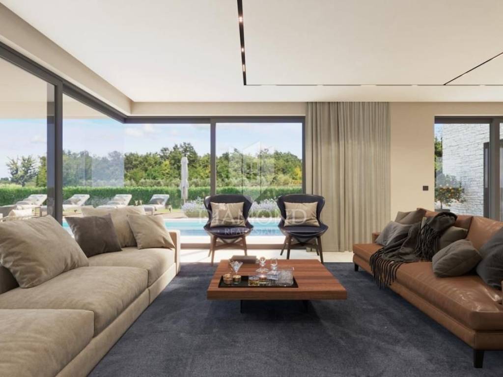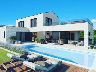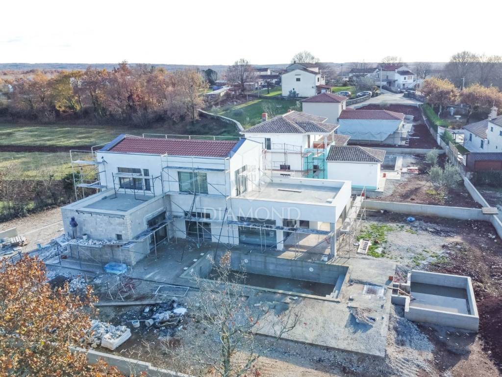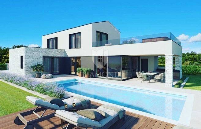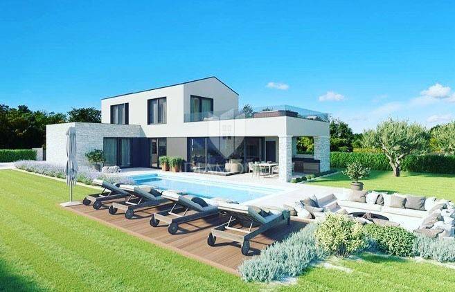 Poreč, surroundings, Impressive villa in a quiet location! This imposing villa, with an area of 170 m2, offers everything you need to live the life of your dreams. It is located in a quiet location, offering you intimacy and rest, but close enough to all the necessary facilities for life. On the ground floor of the villa there is a spacious living room and kitchen, illuminated by the rays of the sun that break through the glass walls, providing constant natural light. 1 bedroom with its own bathroom as well as a guest toilet are also located on the first floor. Upstairs there are two more bedrooms with private bathrooms and spacious roof balconies. There is also a jacuzzi on the balcony of the master bedroom so that you can enjoy the beautiful starry nights and the fresh summer air while your body relaxes in the water. For daytime rest, a large swimming pool of as much as 40m2 awaits you so that the whole family and friends can enjoy it, while the evening is reserved for a charming fire pint so that everyone can gather by the fire and chat late into the night. The property will be ready to move in after the construction is completed in the 5th month! This imposing villa is the perfect property to live in due to its peaceful setting. as well as for renting as a return on investment.