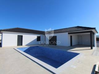 The yard includes a swimming pool with a sunbathing area, a summer kitchen and a secured parking space. The property is in the completion phase and is being sold turnkey. The location offers peace and privacy, and the center of Marčana is only 10 minutes away by car.