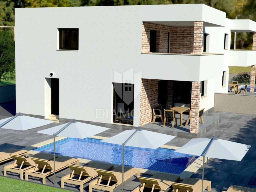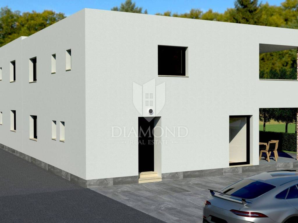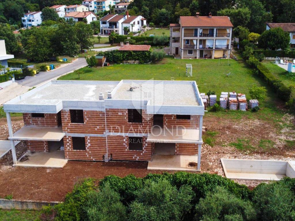 This semi-detached house is located in a quiet place on the edge of the village between Poreč and Vrsar. Its total size is 170 m2 and it is spread over two floors. On the ground floor there is a spacious living room, dining room and kitchen according to the open space concept, one bedroom and a bathroom and toilet. The staircase leads to the first floor, where there are three more bedrooms with their own bathrooms and another room that is intended for a sauna or fitness room or can be converted into another smaller bedroom. The living room leads directly to the terrace where there is a sun deck with a swimming pool. The size of the pool is 25 m2. The house is currently in the renovation phase and is being sold as such so that future owners can have their home finished according to their own wishes and tastes. It is located in an ideal location, where Poreč is only 5 km away. There is an aquapark and tourist camps near the town.