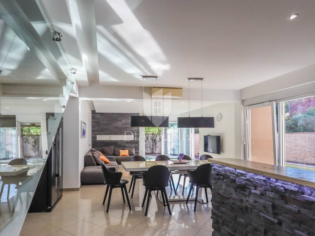 This beautiful house, covering 220m², is spread over two floors and includes five bedrooms and five bathrooms, along with a large ground floor space that includes a living room, kitchen, and dining area. The property also features a swimming pool with a sunbathing area and a lovely covered terrace.