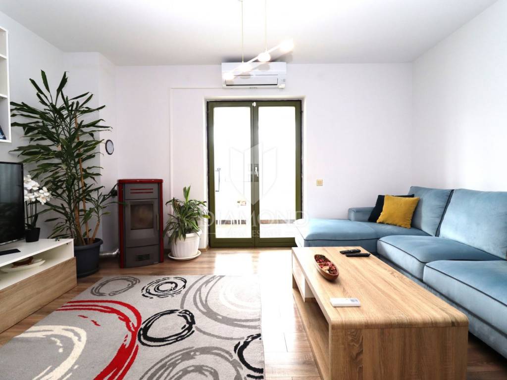 Upper Floor: This floor includes three bedrooms, a spacious bathroom, a living room, and a fully equipped kitchen. Additionally, there are three terraces, one featuring an enclosed 20 m² section—perfect for enjoying sunny days. The upper floor offers maximum comfort with a dual heating system: central warm-air heating with pellets and two powerful 5.5 kW inverter air conditioners. The apartment also has an enclosed winter garden with underfloor heating and electric blinds, ideal for relaxation during colder months. With two separate entrances from the north and south sides, privacy and convenience are guaranteed.