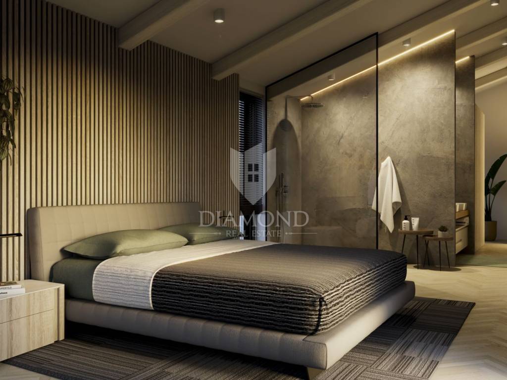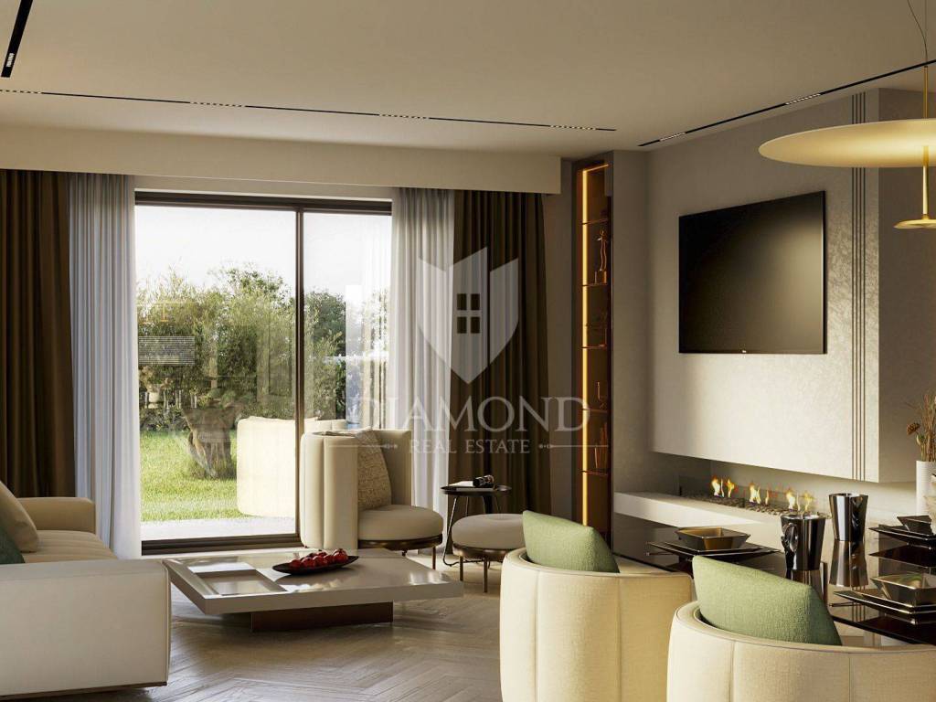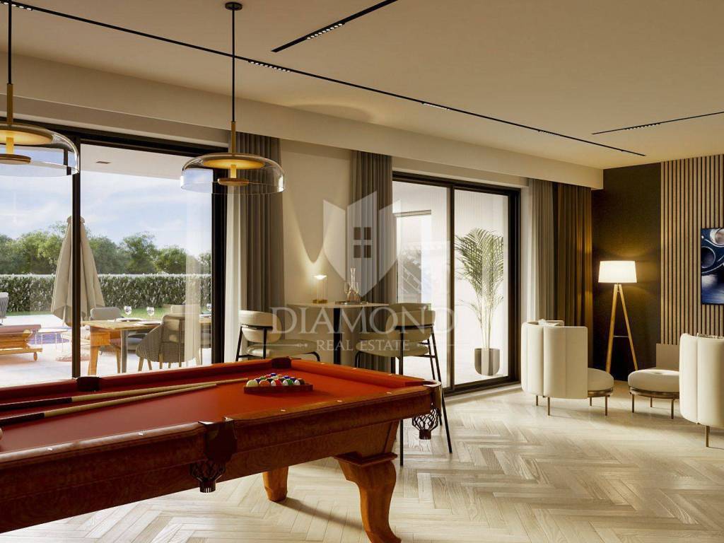 Poreč, villa under construction only 3 km from the city center and the coast! This unique villa with a net area of 324 m² is located in a quiet village near Poreč, just a few minutes' drive from the city center and beautiful beaches. It is architecturally thought out to combine functionality and luxury, and the modern interior offers high-quality materials and handmade furniture adapted to all the needs of future owners. The spacious and open ground floor includes an entrance hall that leads to a central social area, perfect for gatherings, equipped with a pool table and a comfortable seating area. On the right side of the ground floor is a private bedroom with its own bathroom, ideal for guests or family members who value privacy. In addition, there are additional practical rooms - a storage room, a boiler room and a laundry room, as well as a guest toilet. On the left side of the ground floor there is a spacious, fully equipped kitchen that opens onto the living room of 62 m². This space exudes light thanks to the large glass surfaces that connect to the covered terrace, perfect for outdoor dining overlooking the garden and pool. An internal staircase leads to the upper floor, where the central room is designed as a gym with an integrated sauna - a space intended for relaxation and a healthy lifestyle. On both sides of the gym there are three spacious bedrooms with private bathrooms, all with high-quality sanitary elements. Two rooms have a balcony, while the third has a loggia with a view of the garden. An external staircase leads to a beautiful roof terrace of 37 m2 equipped with a jacuzzi and a comfortable seating area. This terrace offers a panoramic view of the surrounding landscape, and it was created for relaxing and enjoying the sunsets. On the spacious garden of 1200 m², there is a private garage and additional parking spaces, and the central place is occupied by a large swimming pool surrounded by a sunbathing area. Next to the pool is a summer kitchen perfect for preparing meals outdoors. The garden has its own irrigation system through a private well, which ensures an always green and well-kept garden. The villa is equipped with a heating and cooling system using a heat pump and air conditioners in every room. Exterior aluminum joinery, as well as the first level of solar panels for energy sustainability, ensure long-term comfort and savings. Considering the proximity of Poreč and all key amenities, the villa allows a peaceful and comfortable life with the availability of everything you need within a few minutes' drive. This property is perfect for a comfortable life, and as an investment it also offers the possibility of a luxury tourist rental. The house is sold fully furnished with high-quality, handmade furniture, which means that it is possible to move in immediately after the completion of the works. The price includes VAT, so the future buyer as a natural person does not pay real estate sales tax.