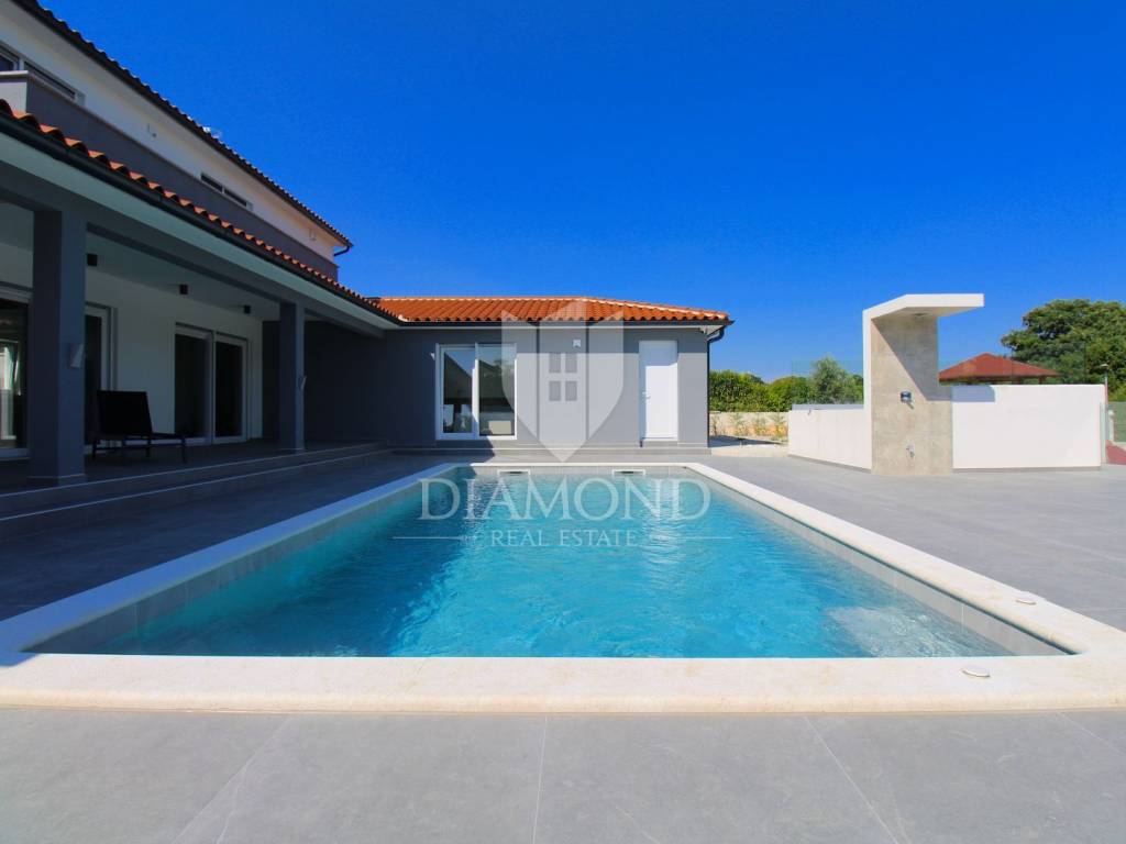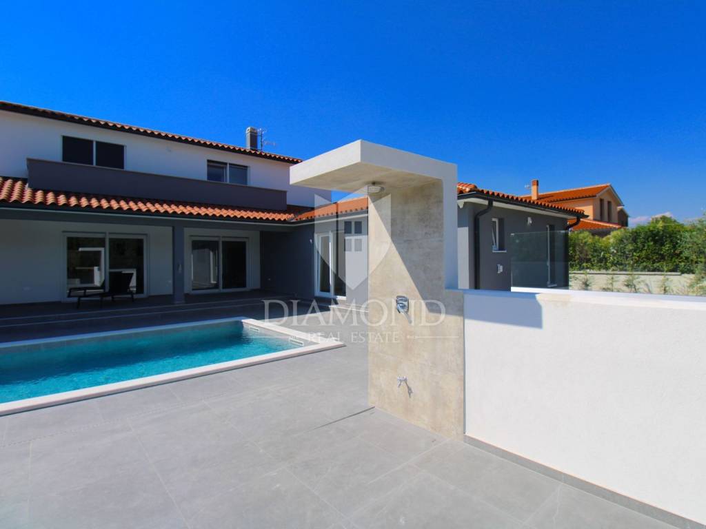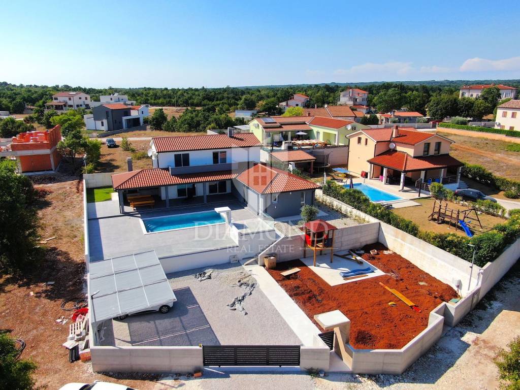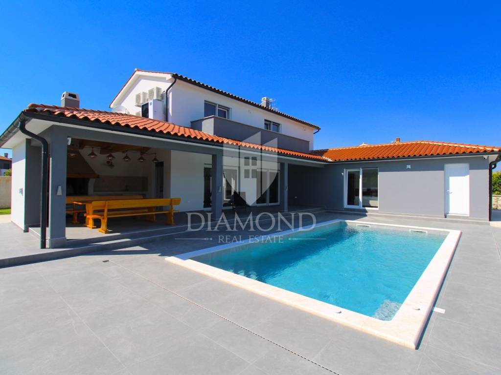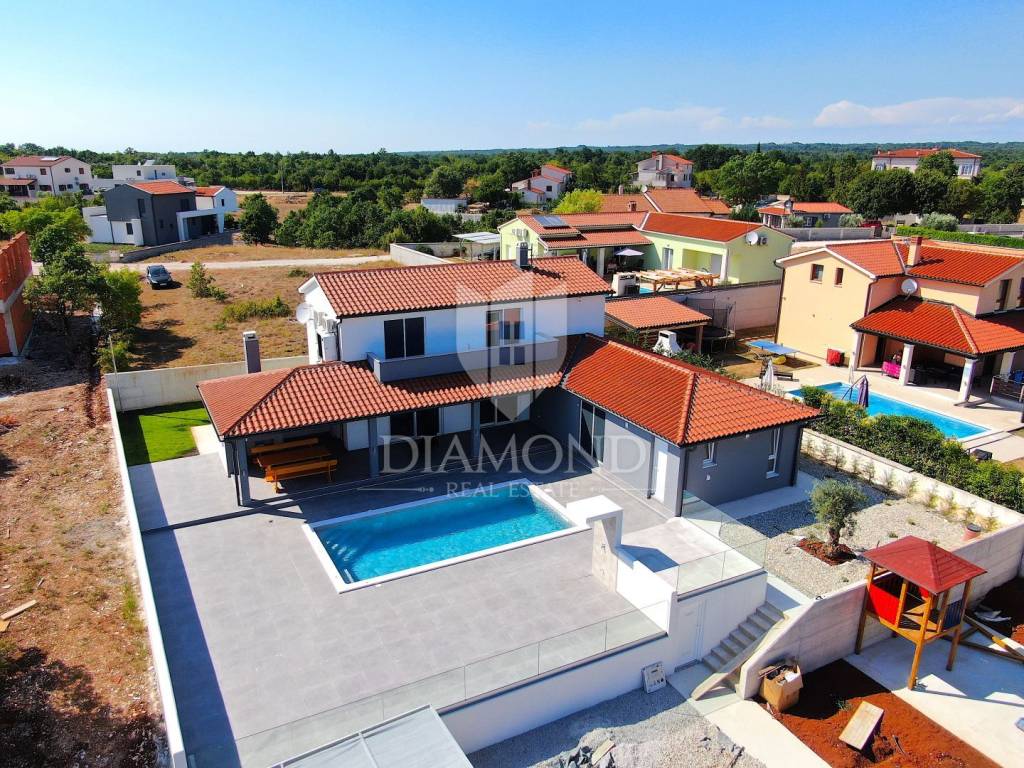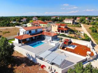 We are selling a new villa with a swimming pool in the area of Central Istria in the vicinity of Svetvinčent. The villa is for sale brand new, unused, equipped and furnished. The villa has a total area of 177 square meters and consists of 3 bedrooms with bathrooms, a large living area consisting of a kitchen, dining room and living room, an additional toilet and a large covered terrace with a summer kitchen. The villa is located on a large fenced plot of 919 square meters, where there is a covered parking lot for 3 cars, a children's playground, a lounge area, and the central part is occupied by a large swimming pool with an arranged sunbathing area. The villa has installed the most modern heating and cooling systems, video surveillance, pool automation, and all of the above is managed using a mobile application.