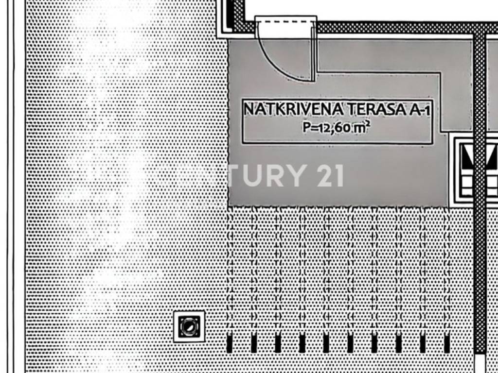 The apartment has an area of 90 m2 and consists of a hallway, bathroom, two bedrooms, and a living room with kitchen and dining area, plus a smaller covered terrace. See the floor plan in the gallery. The staircase leads to the rooftop terrace, which has 12.6 m2 of covered and 62.5 m2 of uncovered area.