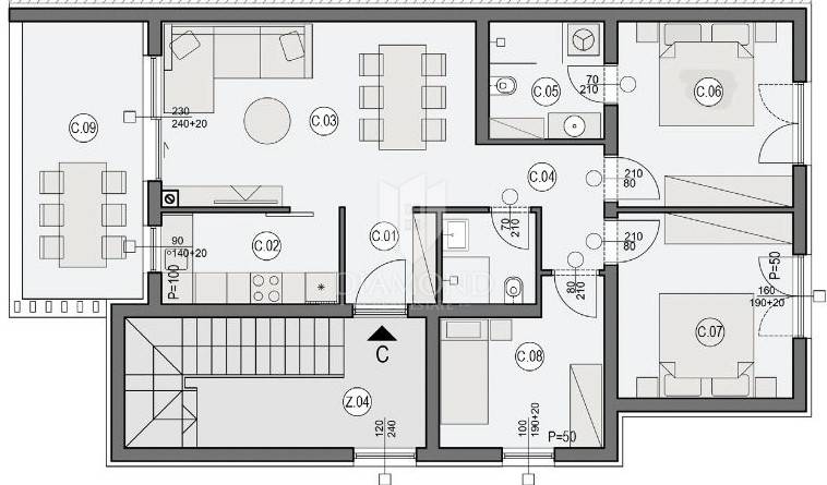 This apartment is located on the second floor of the building. It consists of an entrance hall that leads us to a large open space divided by a living room and dining room with access to the terrace. Below is the kitchen. On the other side is a bathroom and three spacious bedrooms, one of which has its own bathroom. On the ground floor of the building there is a storage room as well as a garage and an additional parking space. The total area of the apartment is 87.32m2.