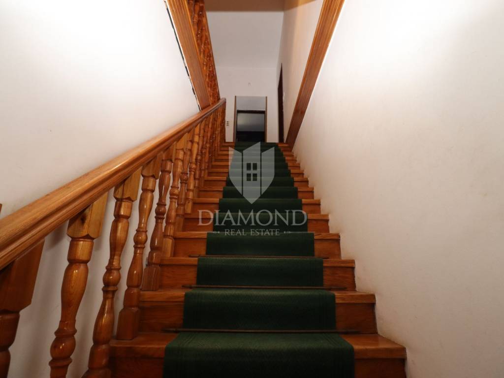 Heating is provided by a central pellet stove system and five air conditioning units, with an additional wood stove on the upper floor. The courtyard is landscaped and fenced, with many preserved details from the time of construction. In addition to the garage parking space, it is possible to park two more cars outside.
