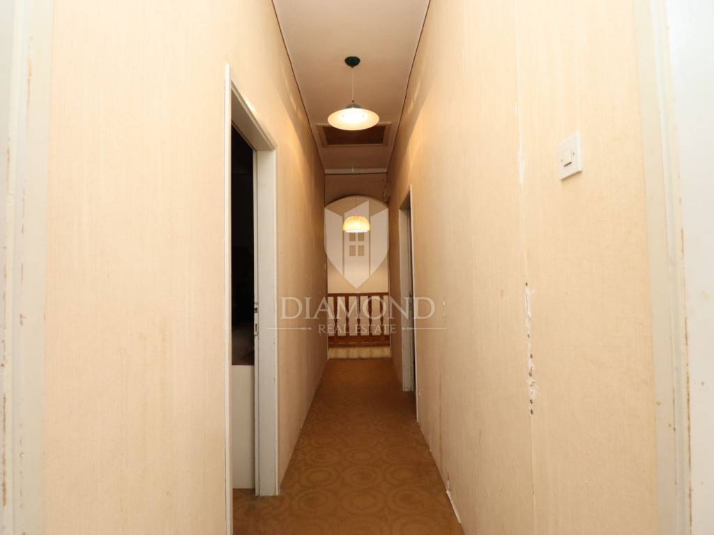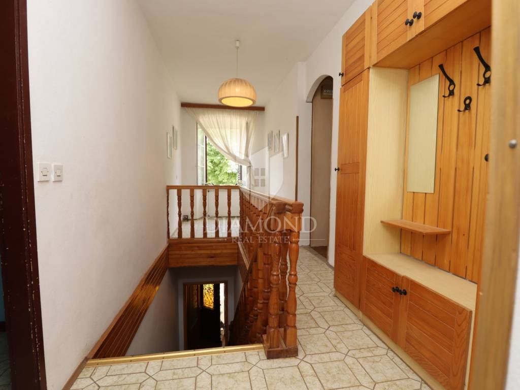 The house is situated on a plot of 880 m², with a total living area of 260 m². It is divided into two residential units, one of which is currently in use while the upper floor requires renovation.