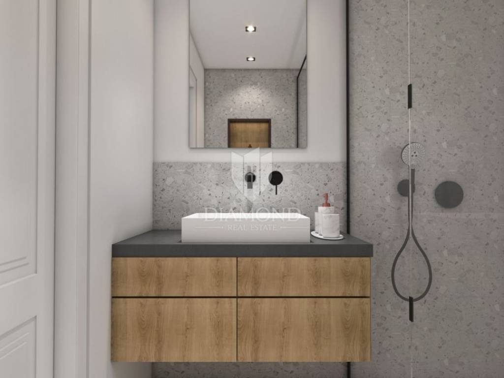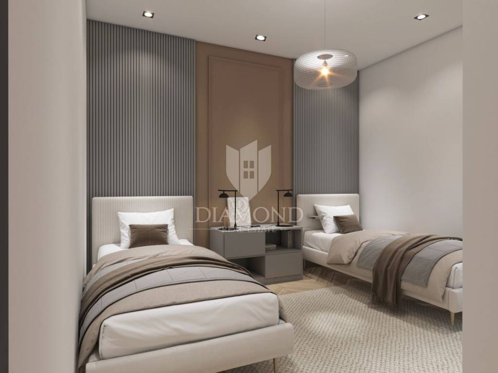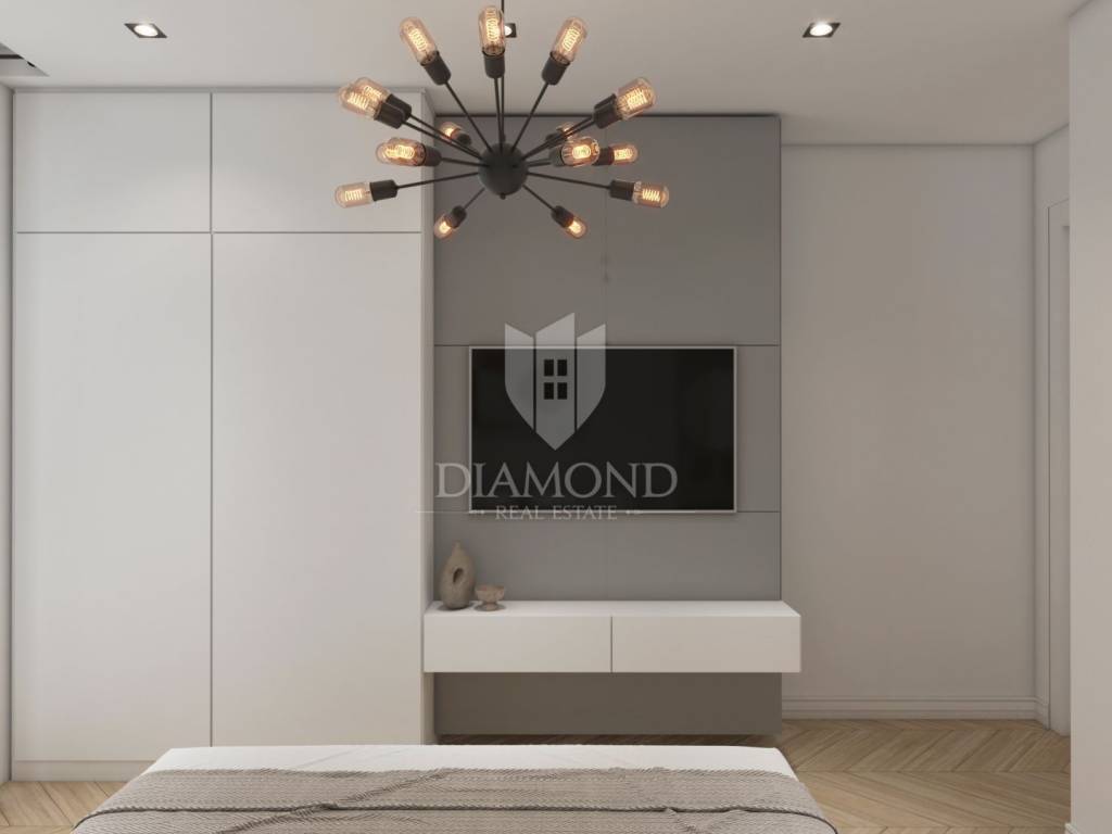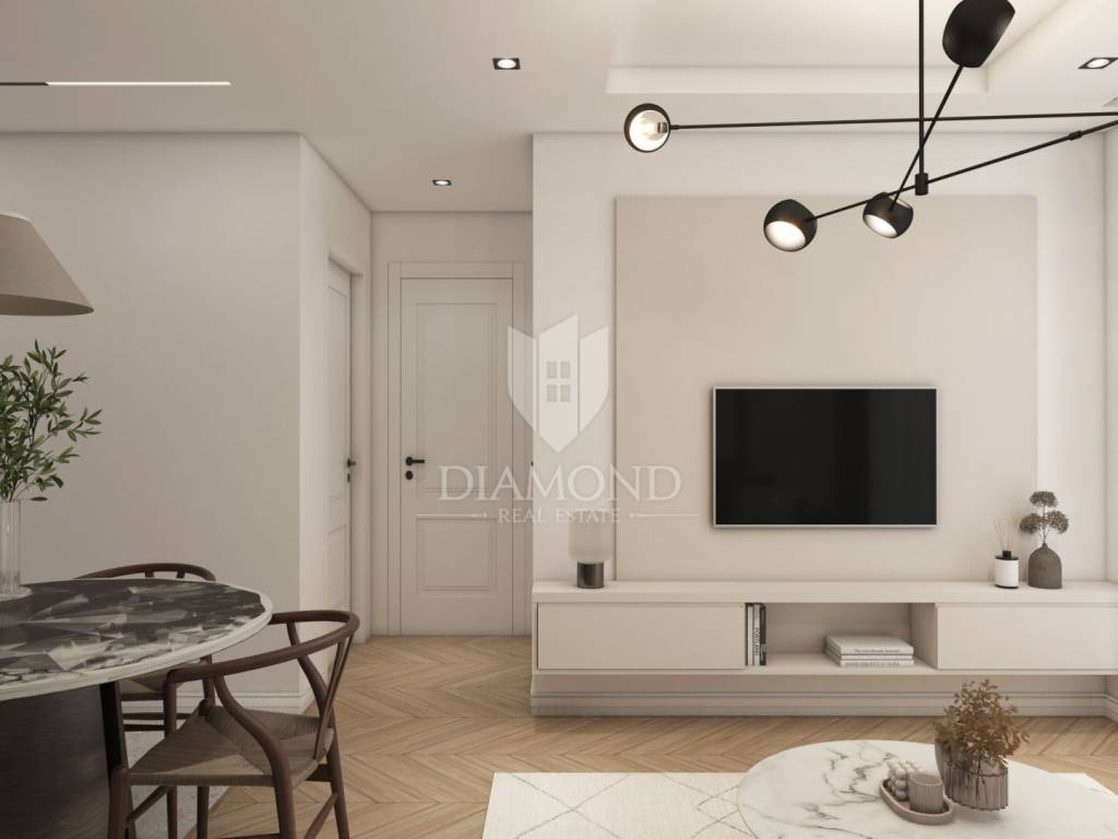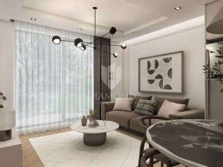 The apartment on the first floor of a modern building offers a bright and functional space for living or tourist rental. It consists of two bedrooms, an elegant bathroom and an open living room with kitchen and dining room, which opens onto a balcony. Here you can enjoy peaceful moments with a view of the surroundings. The apartment is equipped with top-quality PVC joinery with triple-glazed windows and aluminum roller shutters with electric motor. Cooling and heating are provided by ''Mitsubishi'' air conditioners, while electric underfloor heating with wi-fi thermostats allows precise temperature control in all rooms. ''Marca Corona'' ceramic tiles add a touch of elegance and sophistication to the interior.