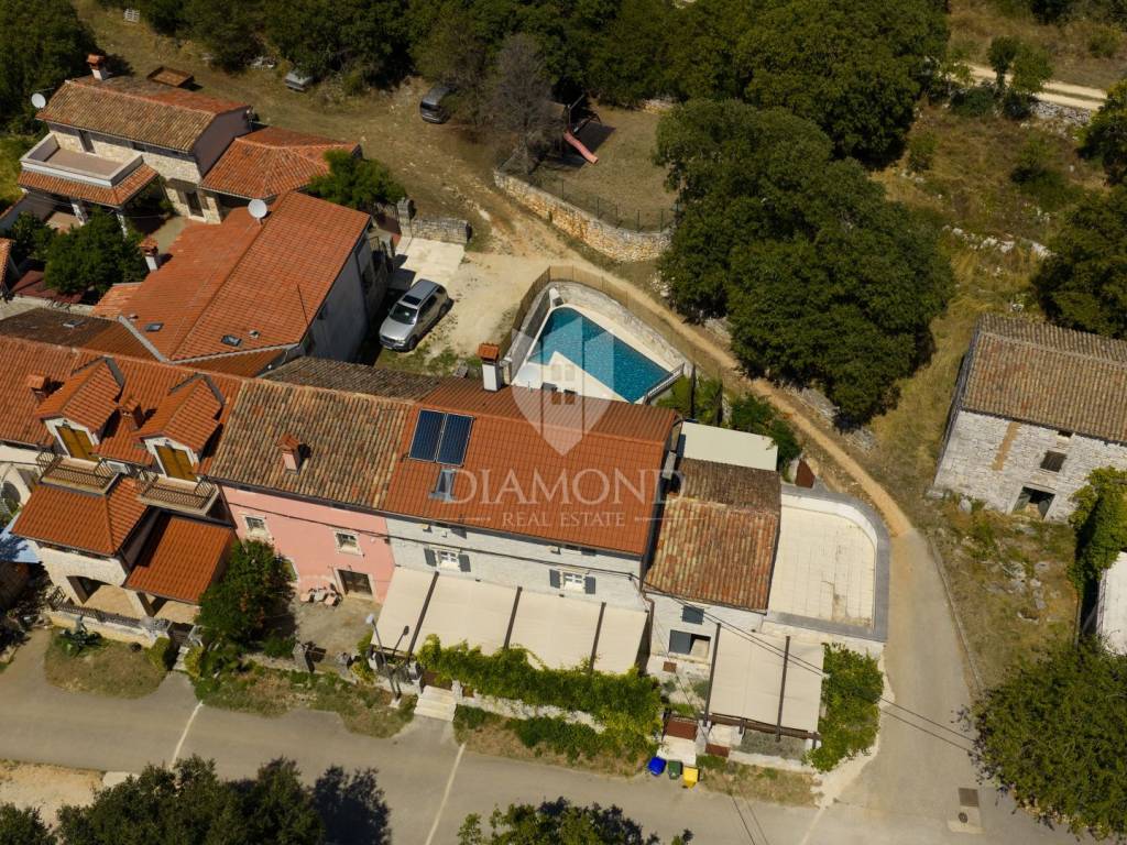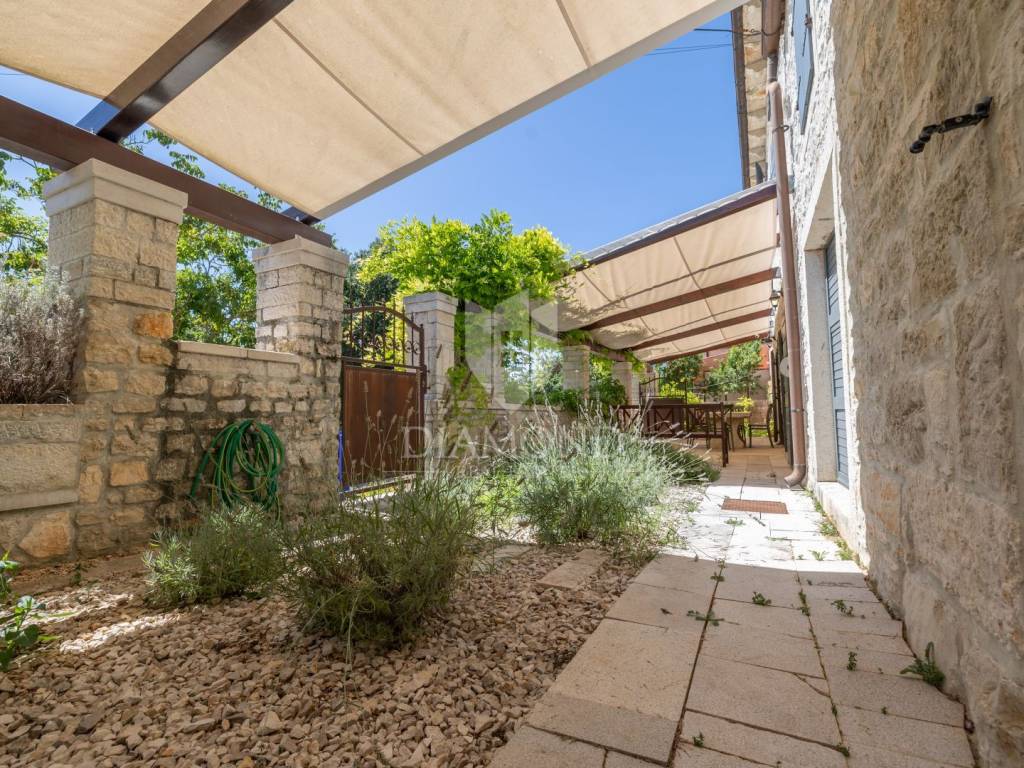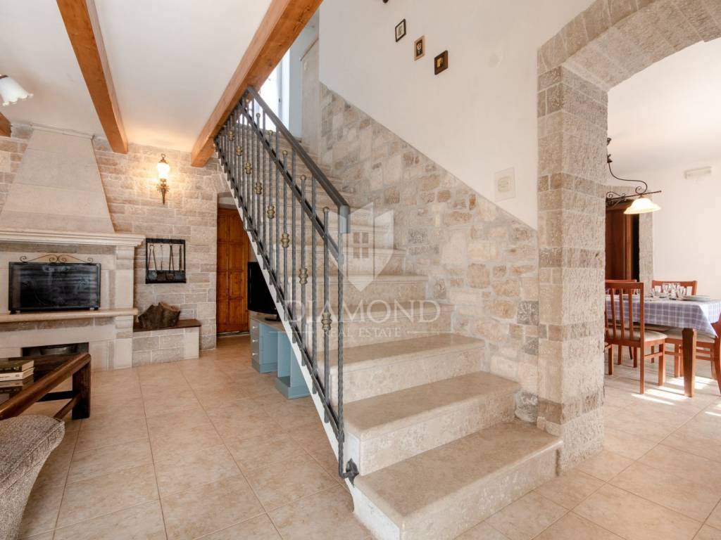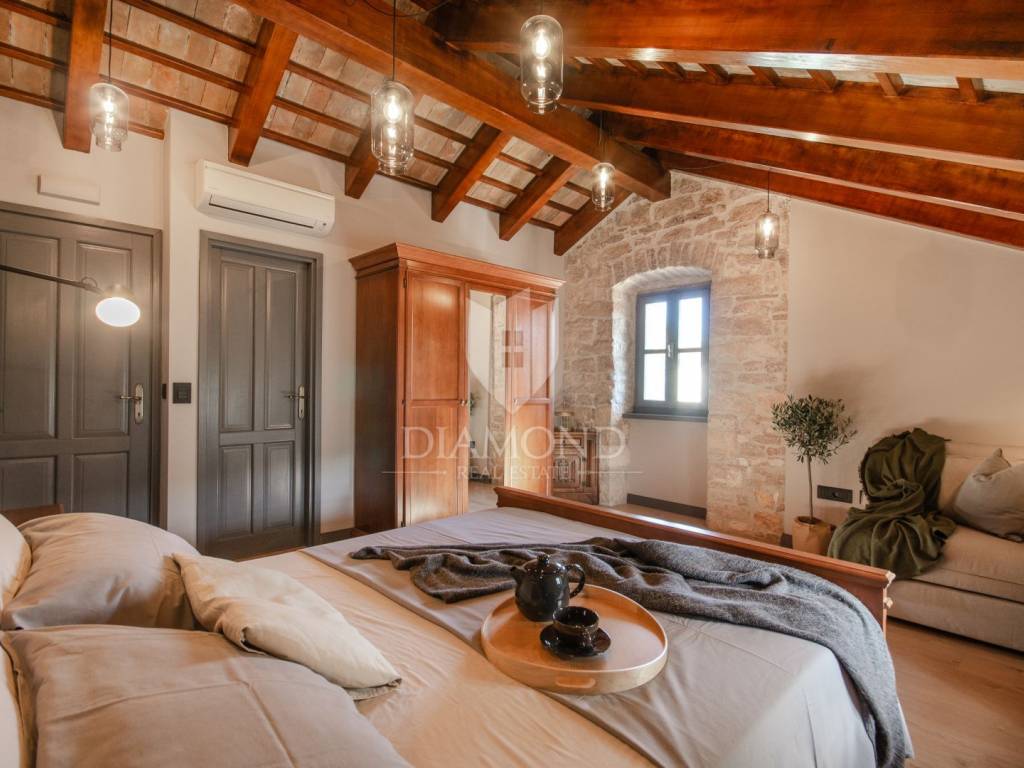 In a peaceful and authentic Istrian village, just a short distance from the stunning town of Rovinj, a spacious stone house is for sale, offering a perfect blend of traditional Istrian charm and modern comfort. The house spans 200 m² of living space and was completely renovated in 2013. During the renovation, a new roof and structure were installed, reinforced concrete floors were built, and all electrical, water, and central heating installations were renewed. New flooring, wall coverings, windows, and modern furniture were added, while the house was equipped with air conditioning and a stone fireplace in the living room, enhancing its warmth and coziness.