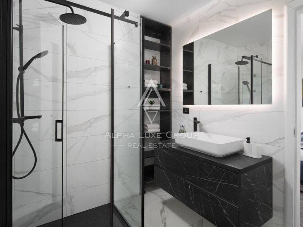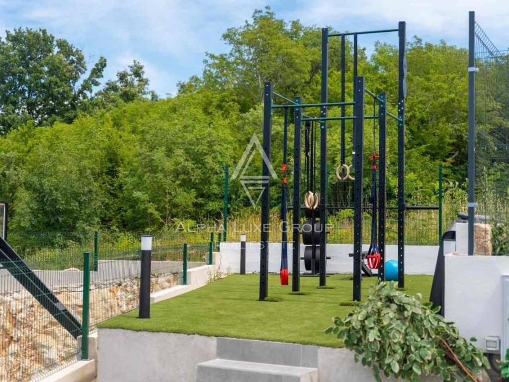 On the ground floor, there is a kitchen with a dining room, a room with its bathroom, and a large living room that opens onto a beautiful terrace and garden decorated in a Mediterranean style, where there is a large heated swimming pool with a sun deck, a jacuzzi, a private multifunctional playground, a gym and summer kitchen.