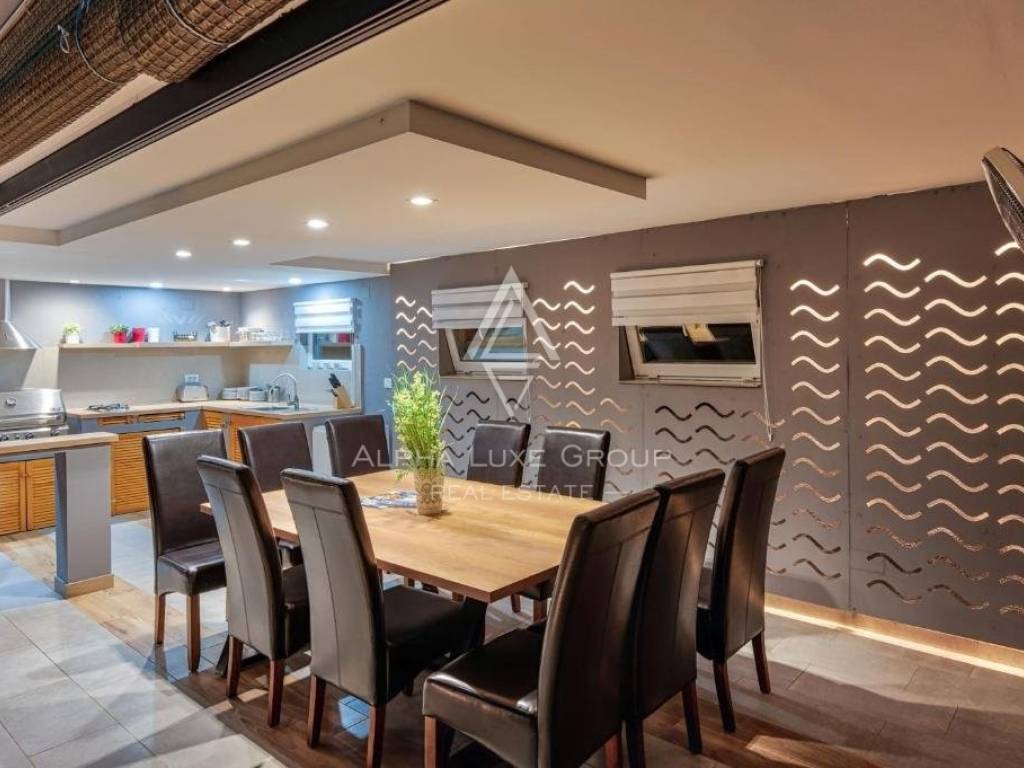 The property is complemented by a generous garden that welcomes you with an elegant driveway and covered parking for two vehicles. The outdoor area is an oasis of relaxation, featuring an infinity pool bordered by a sun deck, a fully outfitted outbuilding that doubles as living space, and an inviting summer kitchen.