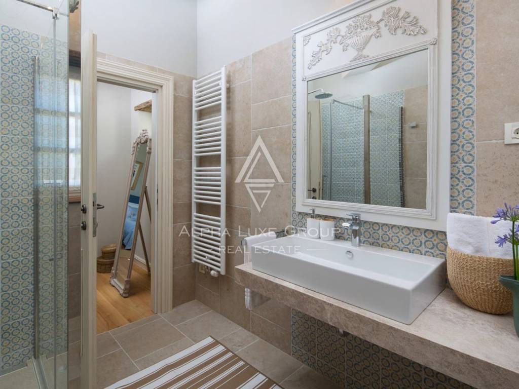 On the ground floor, the villa unfolds into a spacious living room featuring a cozy fireplace, adjacent to a dining area that comfortably seats 8. The rustic, fully equipped kitchen complements the elegant bedroom with a double bed and an en-suite bathroom. Ascend to the first floor to discover three double bedrooms, each boasting an en-suite bathroom. Two bedrooms feature double beds, while the third includes twin beds. Two of these rooms open onto terraces, offering breathtaking views of the verdant Istrian landscape, local pastures with Boškarin cattle, and the distant sea.