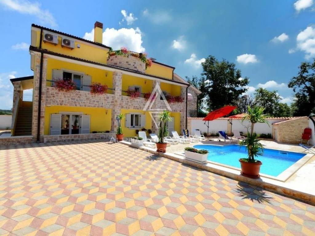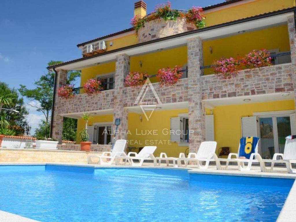 This villa, situated within the wider area of Poreč, spans a generous 486 m2 across three levels. The ground floor houses a spacious 150 m2 apartment featuring three bedrooms. The first floor comprises two 65 m2 apartments, each with access to a large 30 m2 terrace. A substantial 130 m2 apartment is located in the high attic.