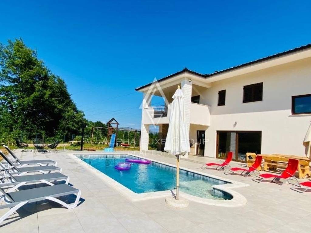 The villa, with an imposing 250 m2 of living space spread over two levels, boasts a serene mountain view. It comprises 4 well-appointed bedrooms, 2 living areas, a kitchen equipped with top-notch appliances, and 5 bathrooms with walk-in showers. A balcony, a pool table, private parking, and complimentary WiFi enhance the villa's appeal. Revel in al fresco dining while gazing at the pool, all within the privacy of your own retreat.