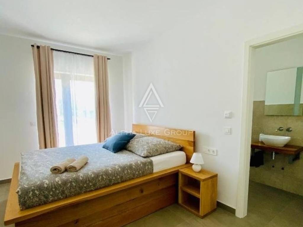The upper floor houses 3 additional bedrooms, each featuring a private bathroom and terrace access, offering panoramic views of lush greenery and Mount Učka.