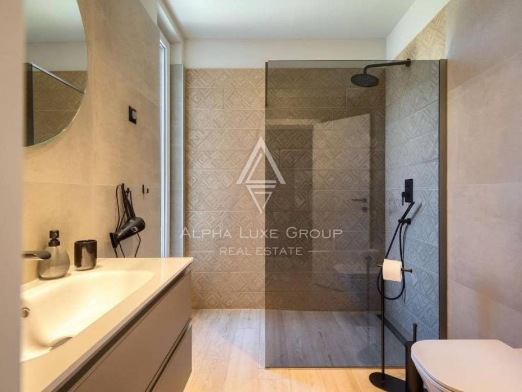 The first floor houses four generously-sized bedrooms, each boasting its own bathroom. Three bedrooms open onto covered terraces, presenting breathtaking sea views. The villa also includes a versatile basement space, perfect for an entertainment room. Comfort is ensured year-round with underfloor heating and air conditioning.