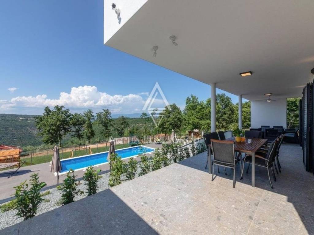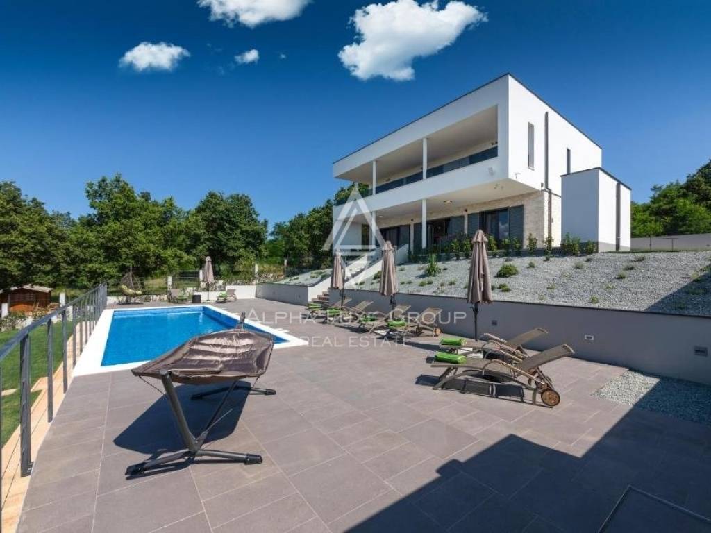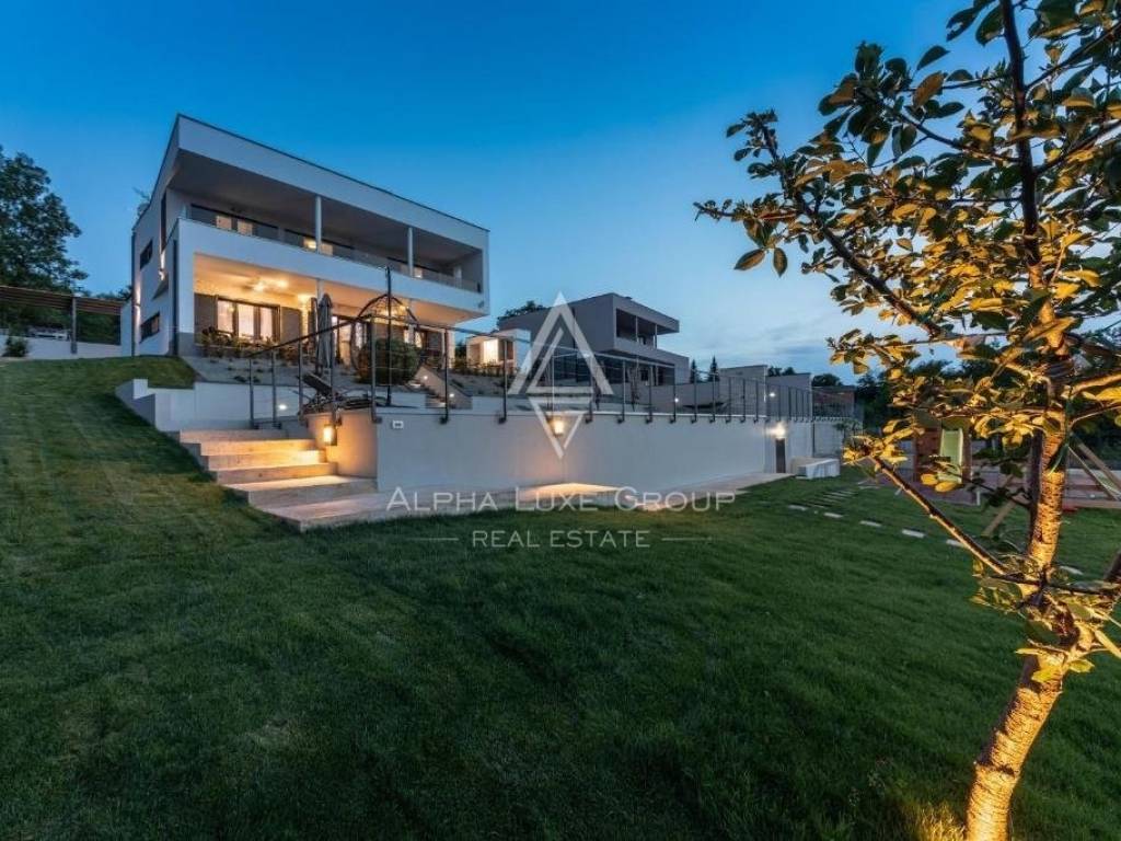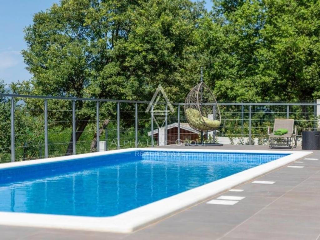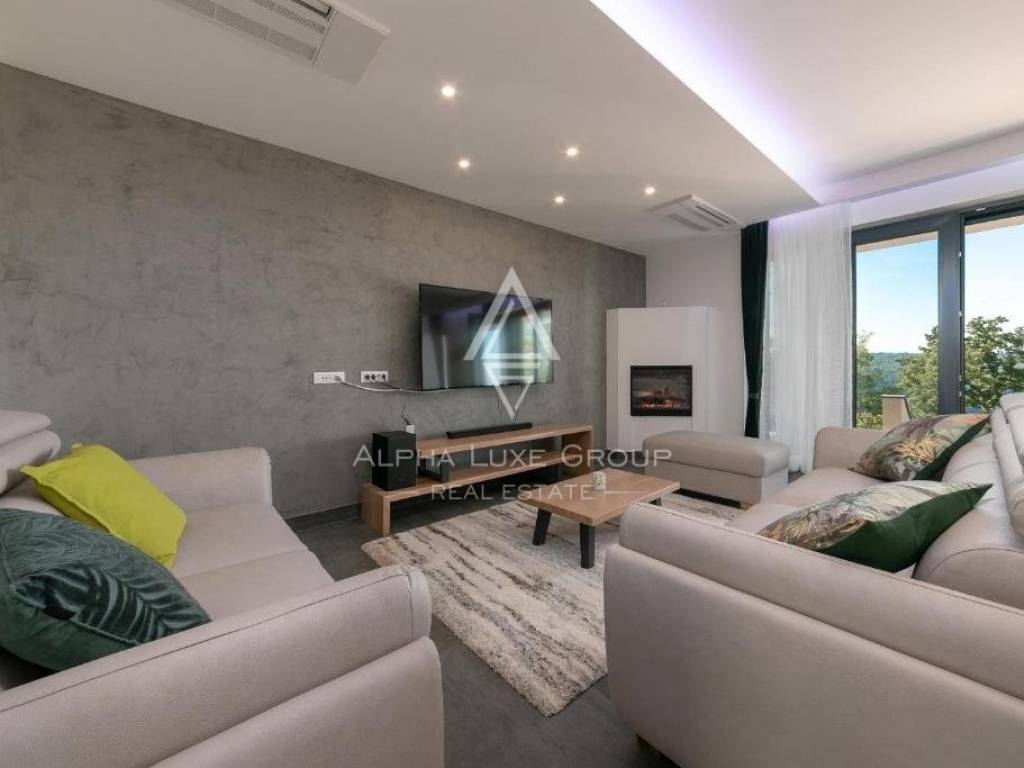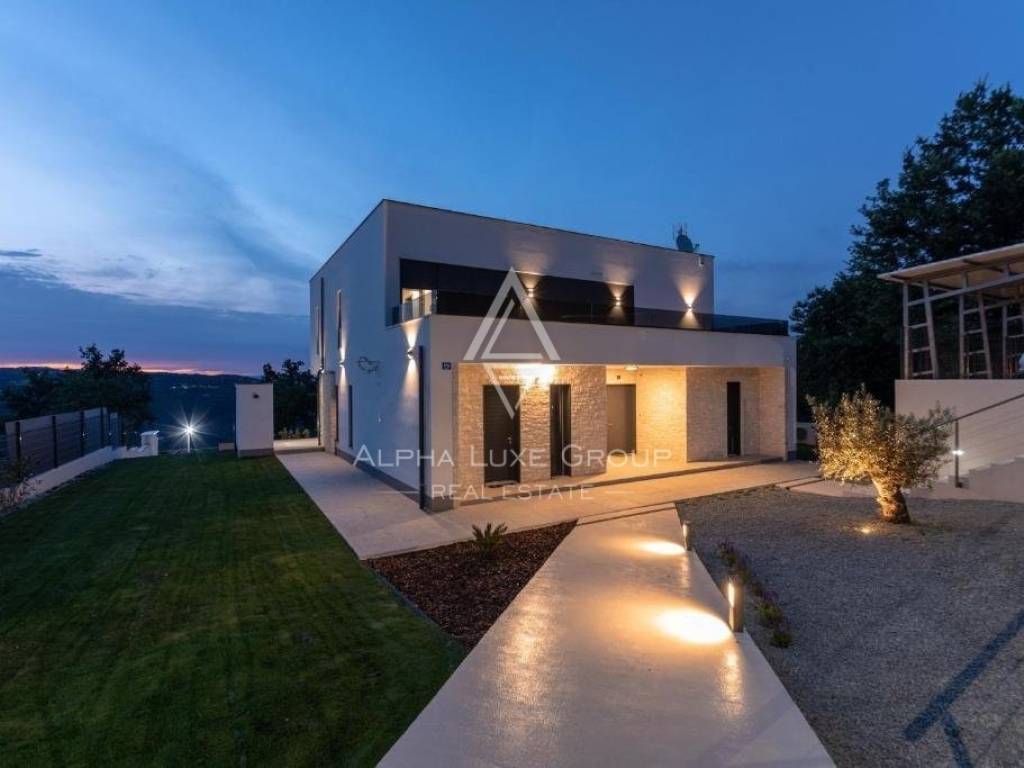 For sale: An exceptional villa embodying modern architecture and the highest standards of construction, nestled in a quaint Istrian village amidst stunning natural scenery, olive groves, assorted fruit trees, and vineyards, all just 12 km from Rabac’s exquisite pebble beaches.