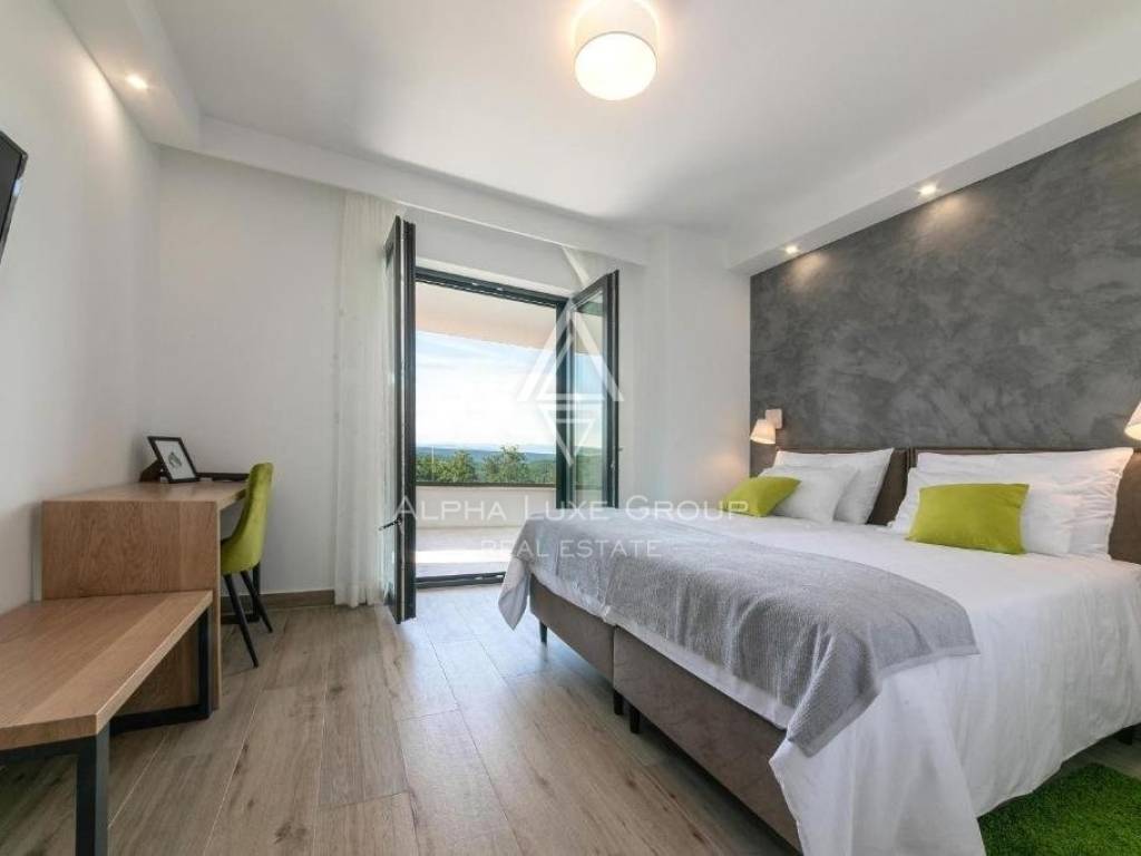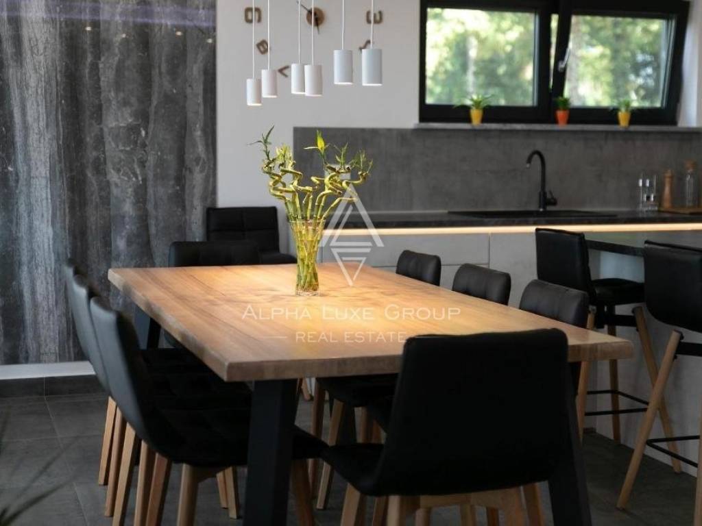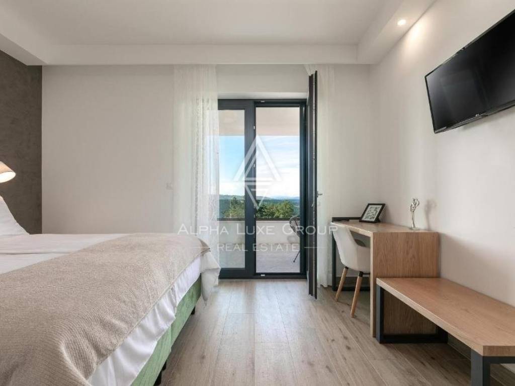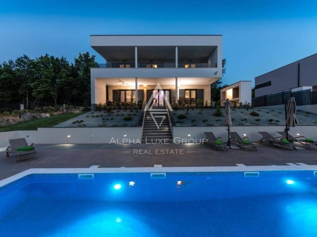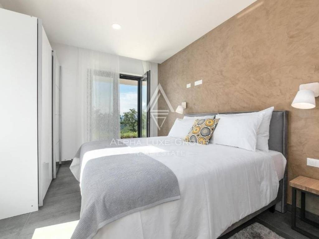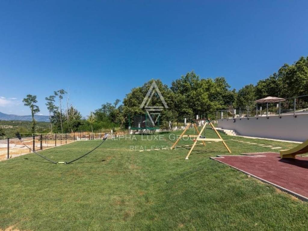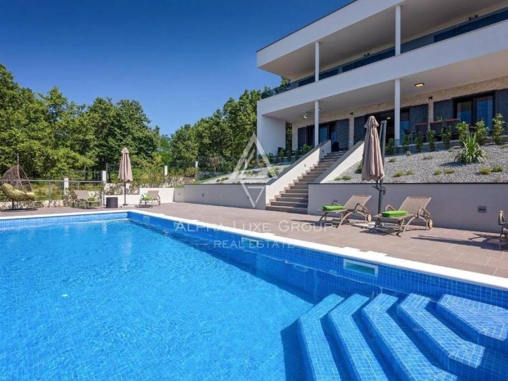For sale: An exceptional villa embodying modern architecture and the highest standards of construction, nestled in a quaint Istrian village amidst stunning natural scenery, olive groves, assorted fruit trees, and vineyards, all just 12 km from Rabac’s exquisite pebble beaches.