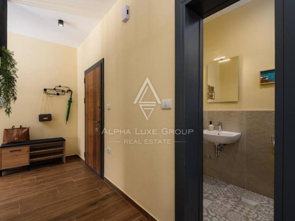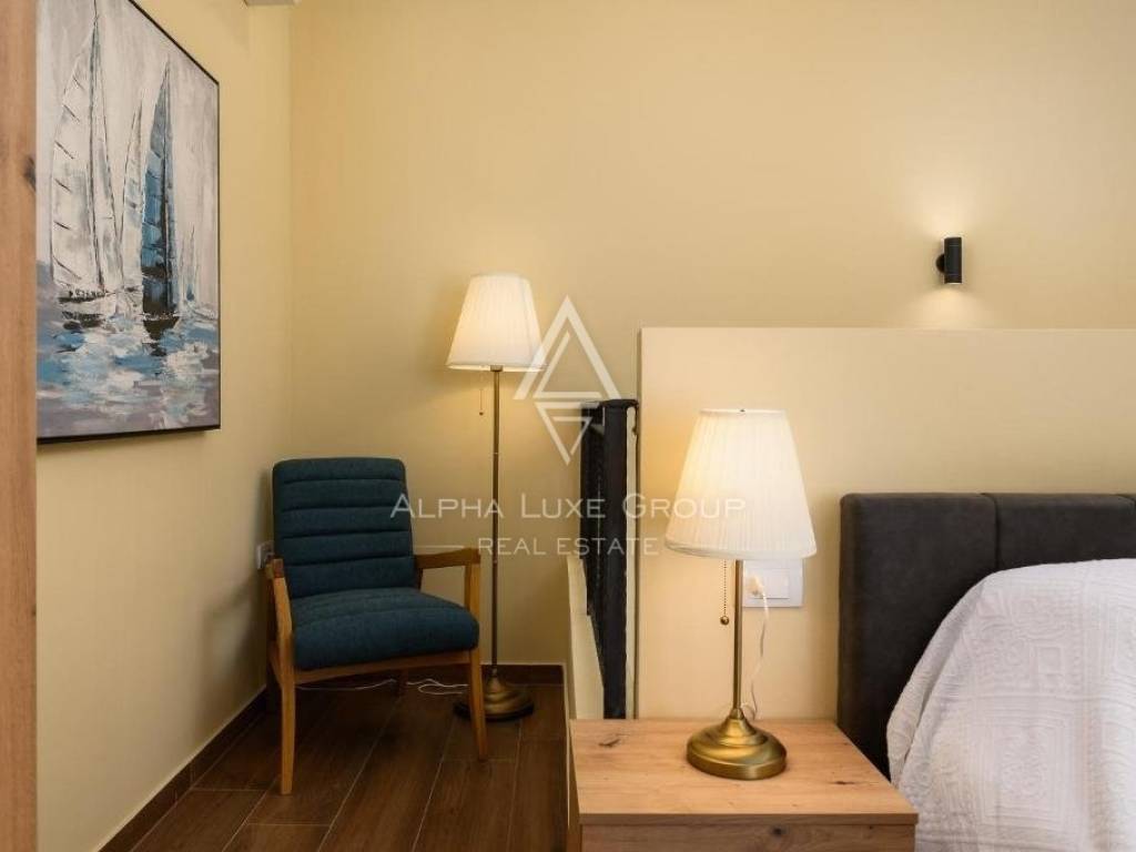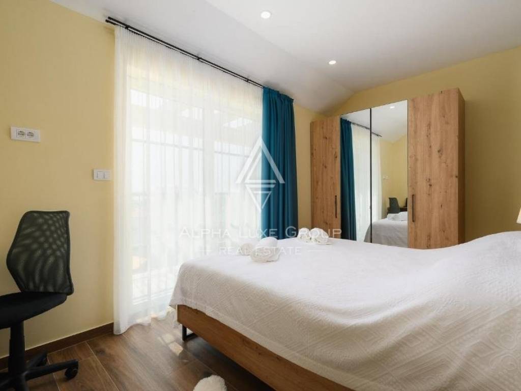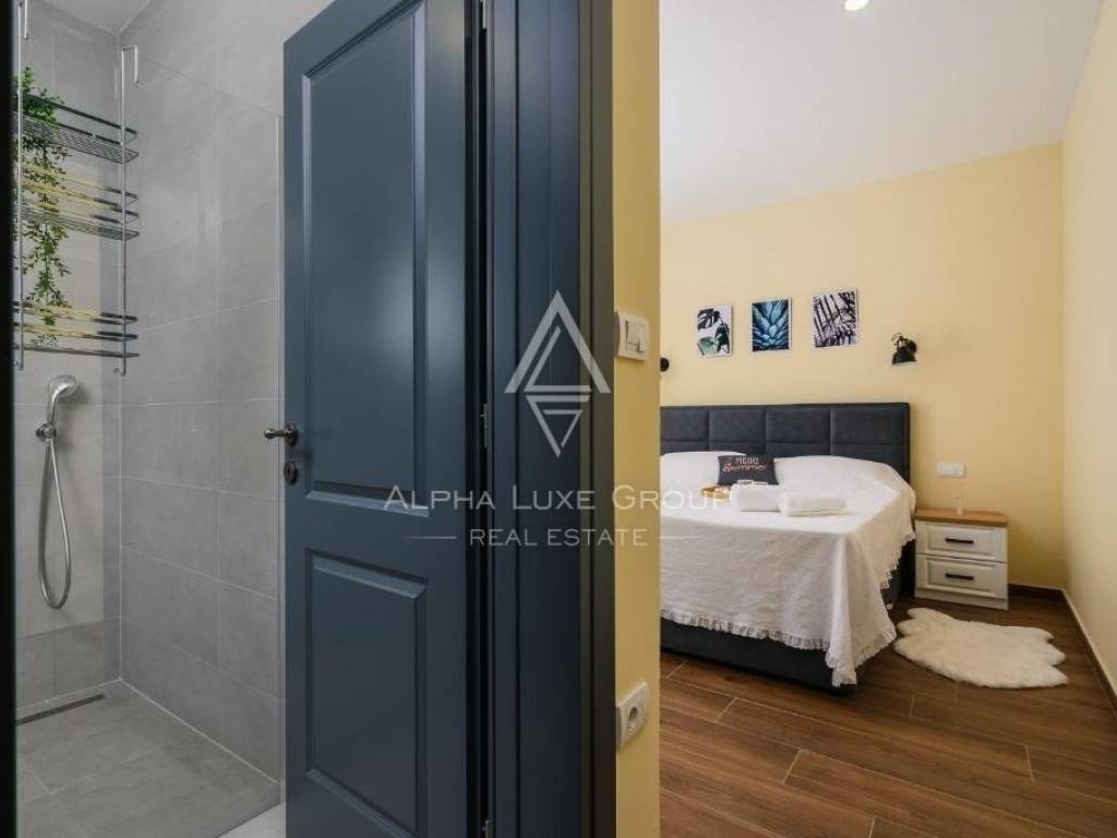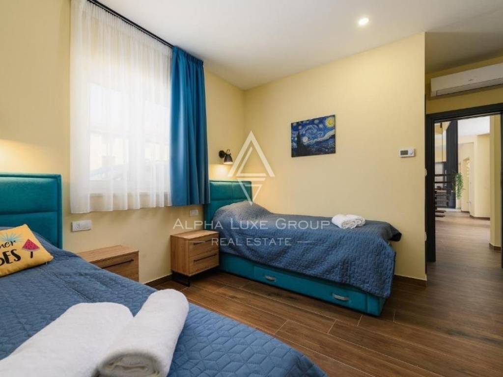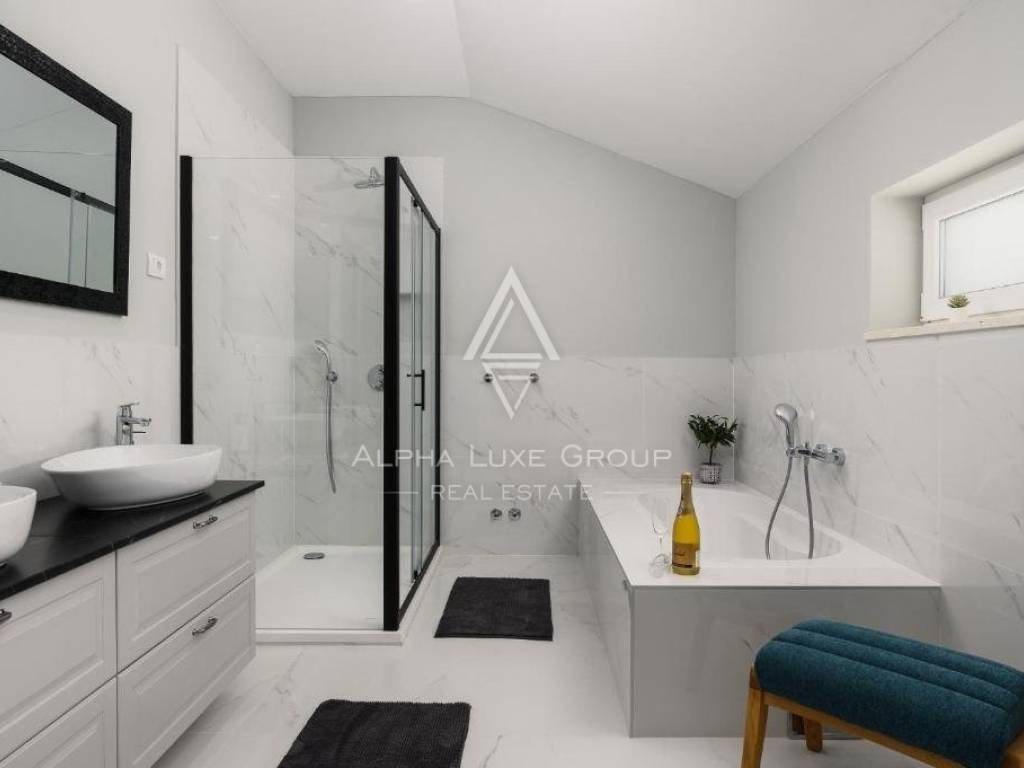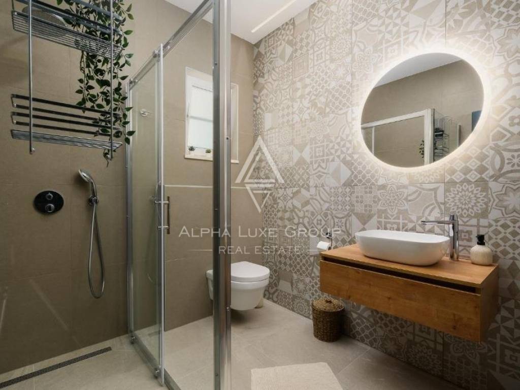 This spacious residence is set in a peaceful neighborhood surrounded by family and vacation homes. It features a seamless integration of attractive exteriors with a modern interior, where each room is meticulously designed. The ground floor boasts an open-concept living space that includes a custom-made kitchen by German manufacturer Moderano, a dining area, and a living room that opens to a covered porch with an outdoor kitchen and additional dining space. The floor also holds two bedrooms, each with private bathrooms, a technical room/storage space, and a guest toilet. A separate studio apartment with its own entrance and an internal oak staircase leading to the first floor, where there is another bedroom, a large bathroom, and a covered terrace, further enhance the layout.