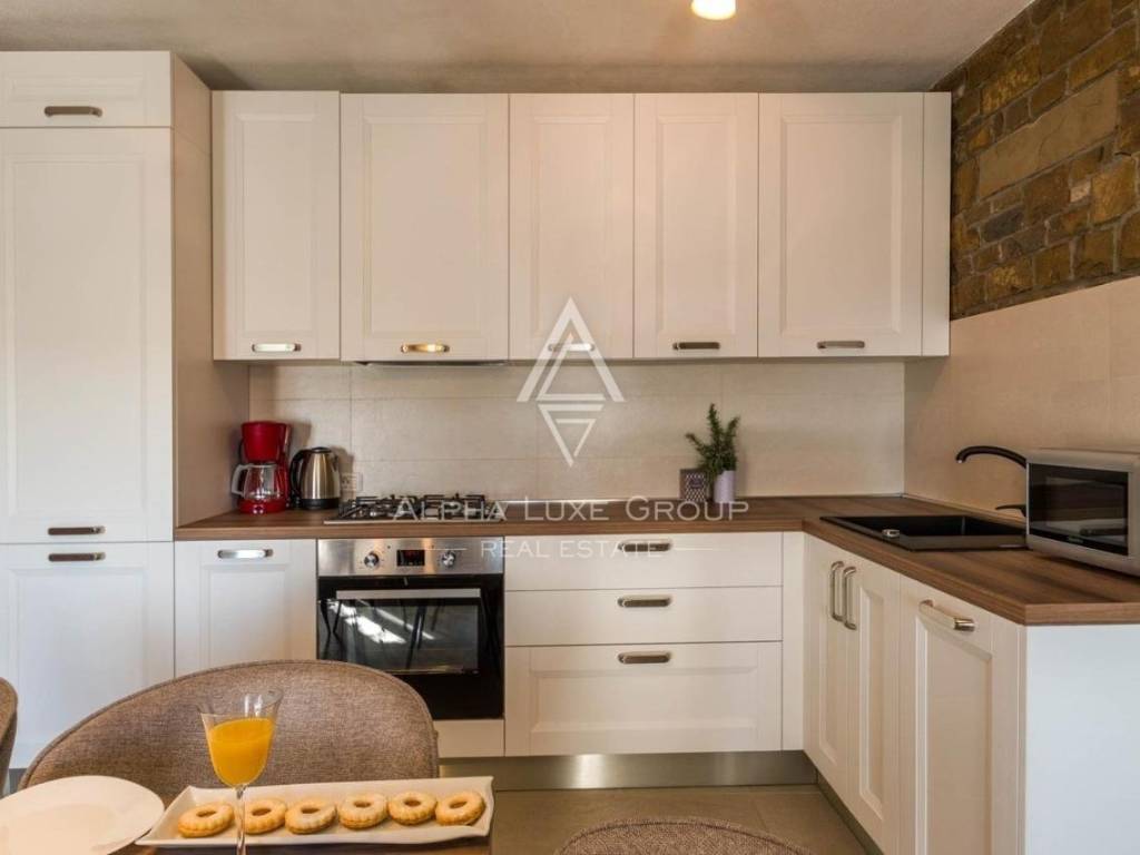 The first house has a total area of 116 m2 and is spread over a garden of 400 m2. The house has a kitchen, a living room with a wood-burning fireplace, three bedrooms, and three bathrooms. The living room leads to a covered terrace with a swimming pool, sun deck, a barbecue, and a panoramic view of the beautiful Istrian hills.