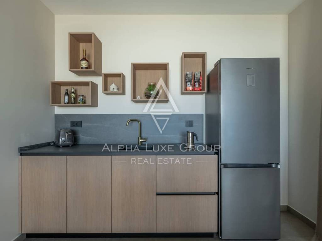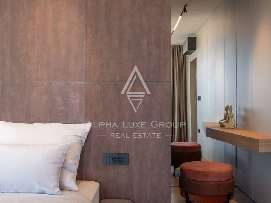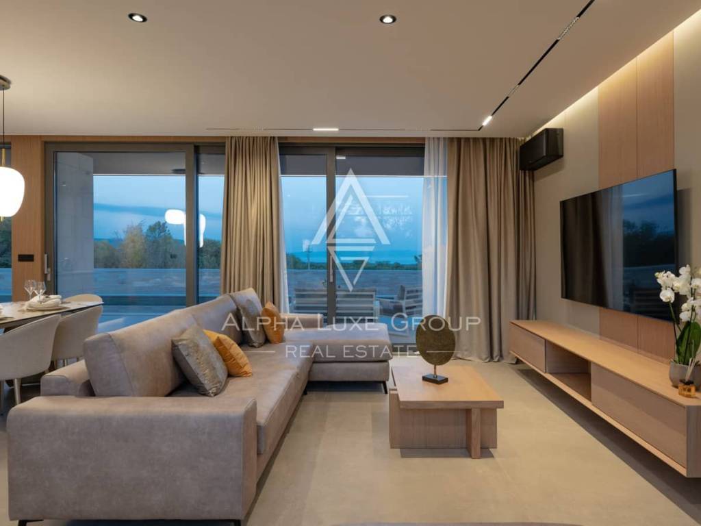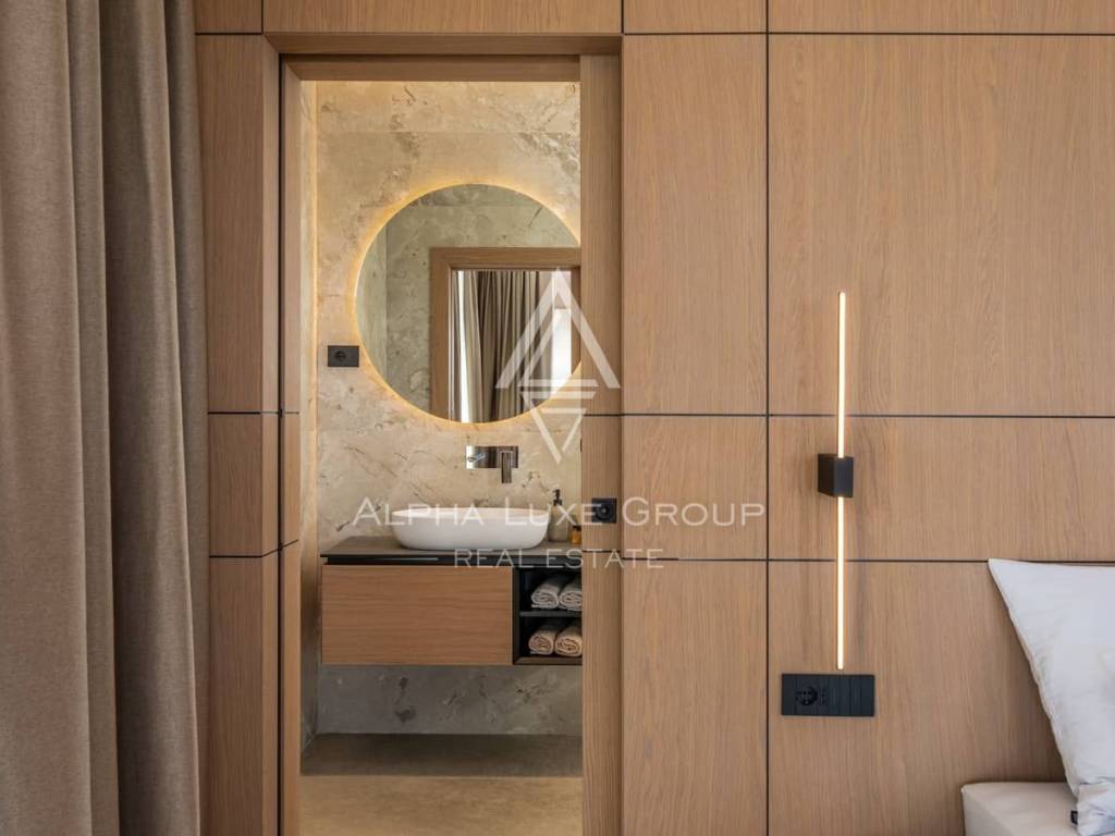 An internal staircase leads to the first floor, where three generously sized bedrooms await—each featuring an en-suite bathroom, a private dressing room and access to a covered terrace offering an unforgettable panoramic sea view. Large glass surfaces ensure ample natural light and create a harmonious connection between indoor comfort and outdoor beauty.