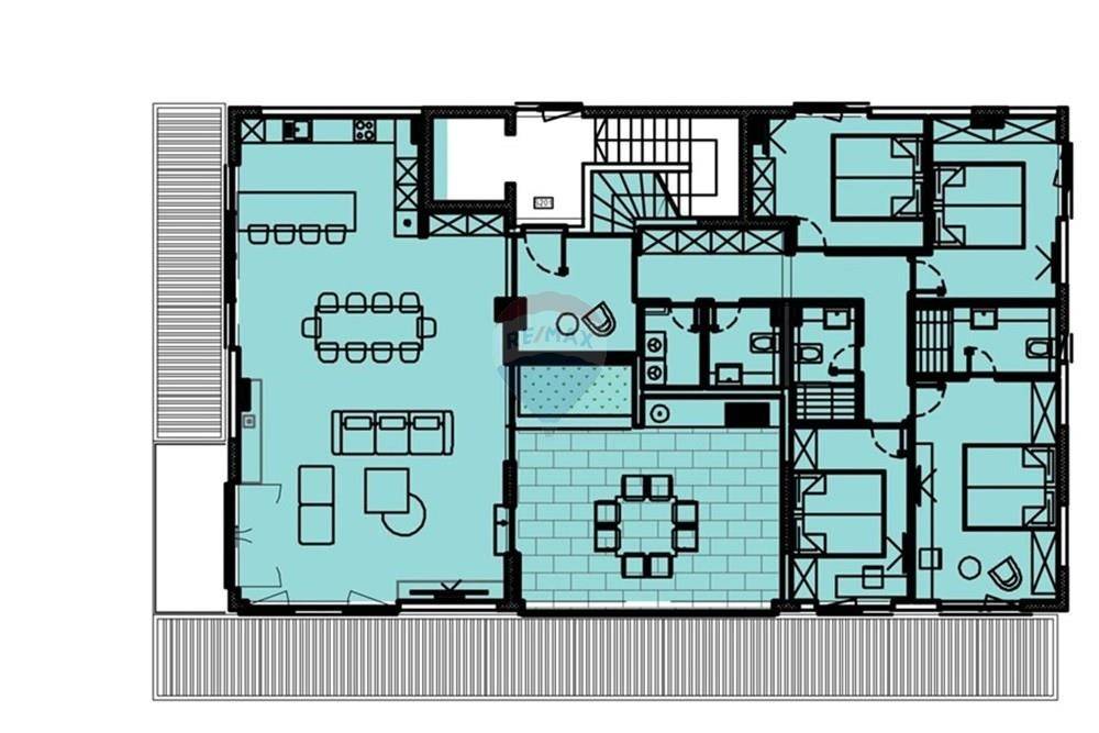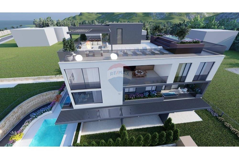 It consists of: entrance hall 8.11m2, hallway 12.87m2, bedroom 1 11.64m2, master bedroom 18.06m2, living room with kitchen and dining room 68.96m2, bedroom 2 13.59m2, bedroom 3 12.36m2, bathroom 1 4.25m2, bathroom 2 5.57m2, toilet 3.45 m2, laundry room 2.73m2, loggia 34.34m2, staircase 12.40m2 and roof terrace 197.45m2.