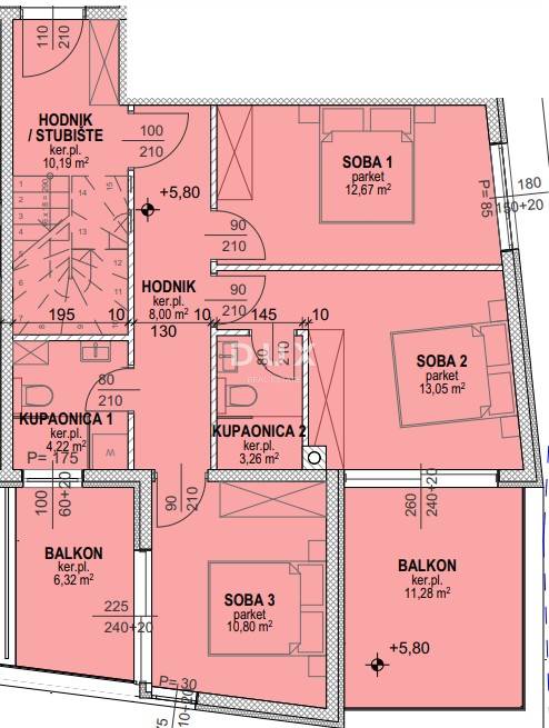 A two-story apartment in a new building is for sale. The apartment consists of three bedrooms, 2 bathrooms and 2 balconies on the first floor and a kitchen with a living room and a balcony on the second floor. The apartment also has one parking space. The building in which the apartment is located consists of ten (10) residential units and the entrance is from the outdoor area on the northeast facade. The apartment is oriented southeast and is located on the 2nd and 3rd floors. The entire building is built with high-quality materials and with quality sound and thermal insulation. Heating of the apartments, cooling and preparation of hot water are solved by heat pumps. The apartment is equipped with high-quality ceramics and parquet floors. All interior doors are wooden, with door frames the width of the wall. In all rooms in the apartment, the installation of PVC windows with double thermal insulation glass with glass panels 4 mm thick is planned. The building is equipped with security and panic lighting with lamps with an autonomous power source (accubattery), operating autonomy for 3 hours after the loss of mains power.