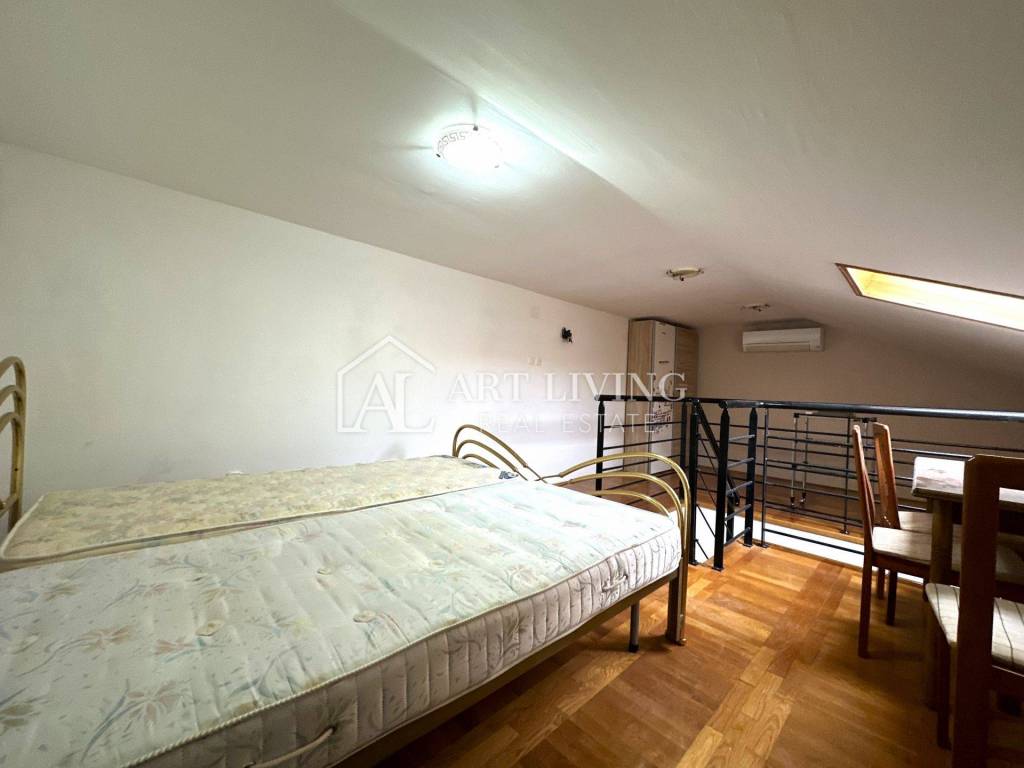 The apartment is located on the first floor of a smaller residential building and consists of an entrance hallway, living room with kitchen and dining area, children’s bedroom, bathroom, spacious attic arranged as a second bedroom, and a large covered balcony (loggia) accessible from the living room.