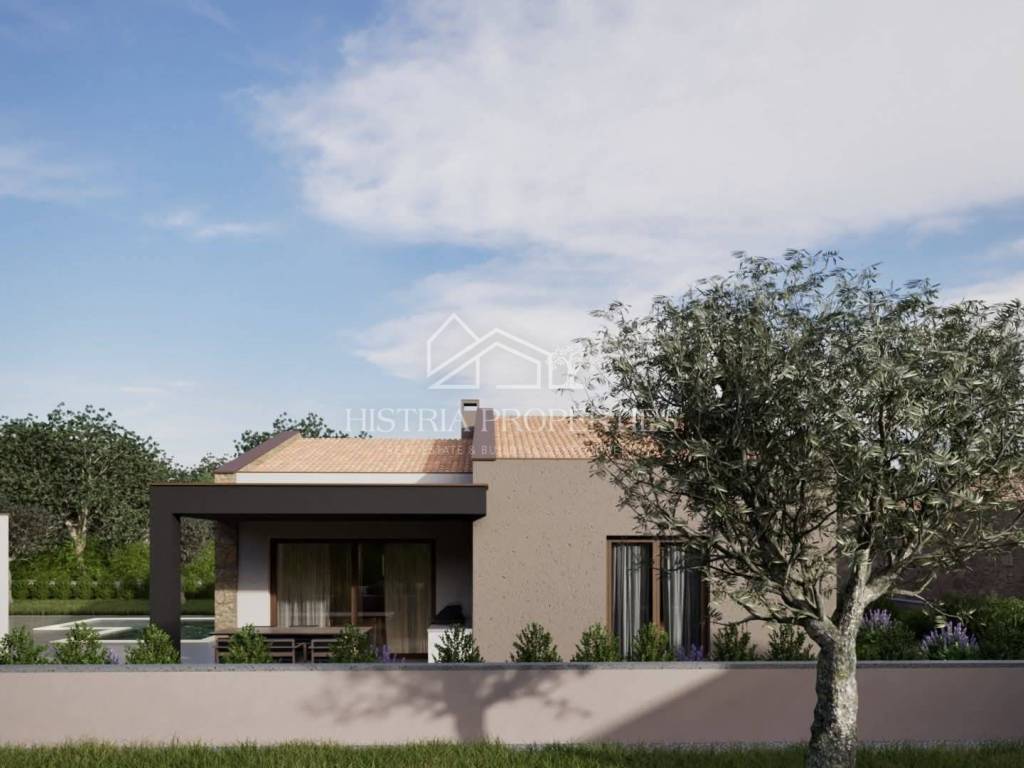 In a quiet location along a local road, this elegant single-storey house with a modern-style swimming pool is located, complete with rustic details and part of the facade made of natural stone.