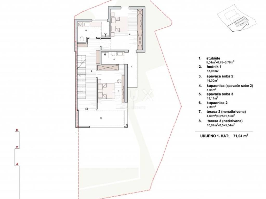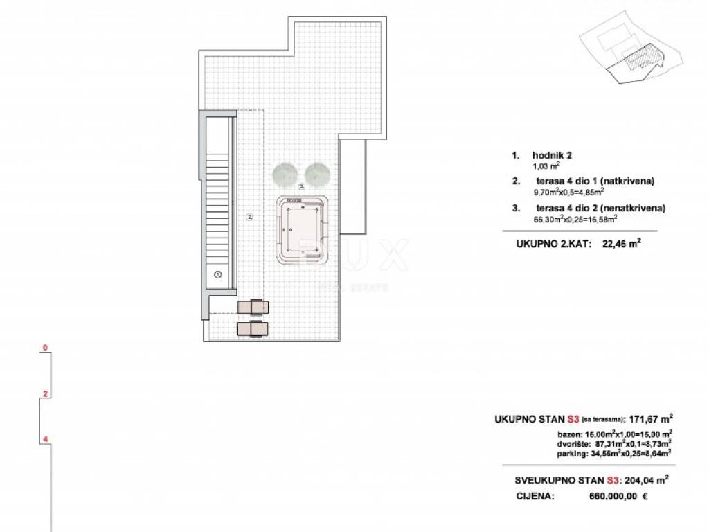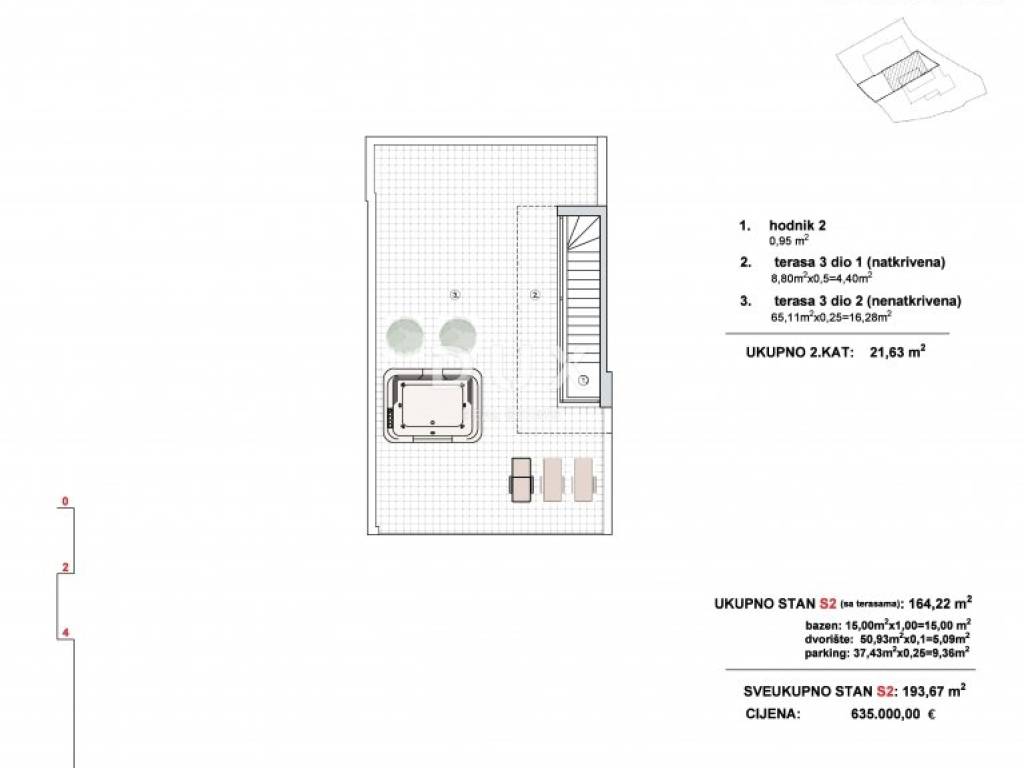 In addition to the ground floor and first floor, unit S3 also has a spacious roof terrace, designed as an exclusive space for enjoying the view, peace and evening atmosphere. A jacuzzi is planned, and the terrace offers an open panoramic view of the sea and the surroundings.