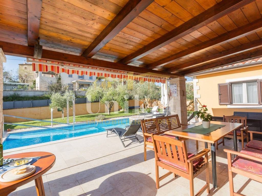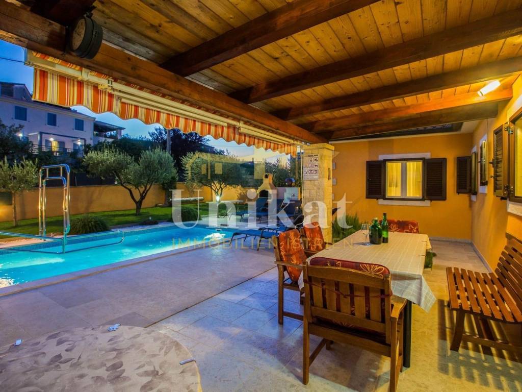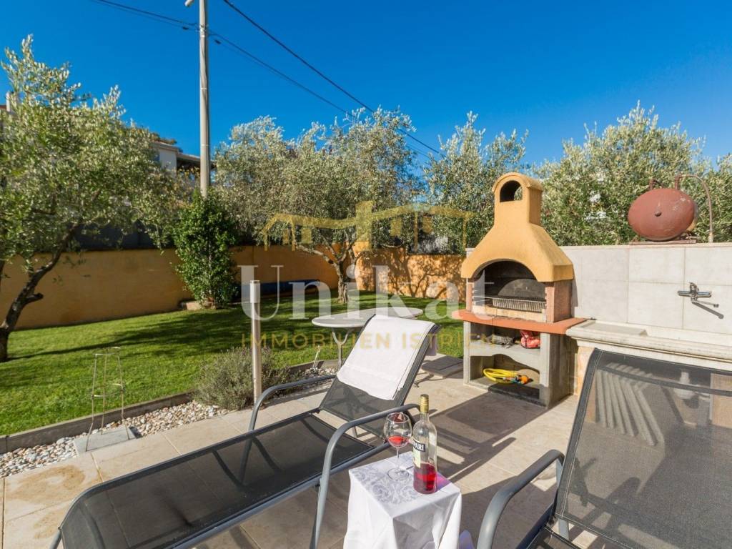 Na vanjskom dijelu se nalaze lijepo uređeni vrt, bazen (21 m2) sa sunčalištem i vanjskim solarnim tušem, mala ljetna kuhinja (roštilj, sudoper, solarni bojler). Ispred kuće se nalazi natkriveni parking za dva vozila. Cijela okućnica je ograđena viskom zidom.