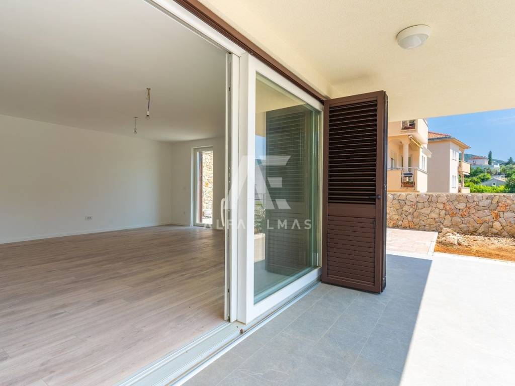 Cres, new build, luxury three-room ground floor apartment of 115 m2 in an exclusive location just 200 m from the sea and associated amenities!! The luxurious three-room apartment consists of an entrance hall, three bedrooms, two bathrooms, a living room, a kitchen and a dining room, combined into one unit from which there is an exit to the spacious covered terrace of 80 m2 which is equipped with preparation for a whirlpool . The high-quality equipment includes PVC joinery with shutters, electric underfloor heating in the bathrooms and living room with kitchen, a large 5.5 kW air conditioning system sufficient to cool the entire apartment, high-quality ceramics and sanitary fittings in all bathrooms. The luxury apartment has a storage room in the basement of 7 m2 and a garage parking space in the garden. The documentation is fine.