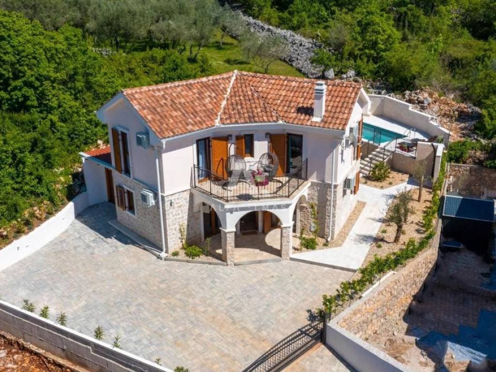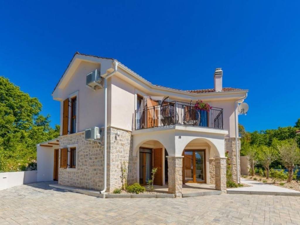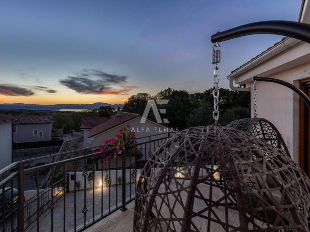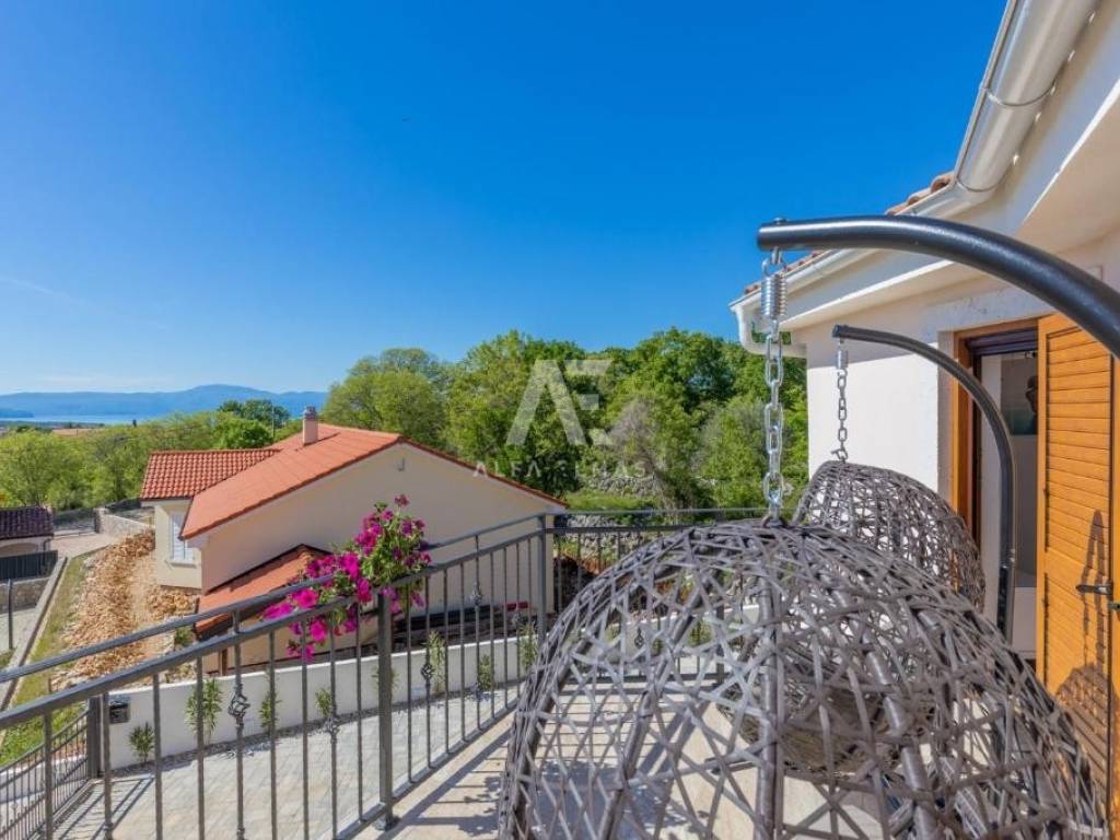 In the quiet and attractive surroundings of Malinska, set against a breathtaking sea view, lies this exclusive detached villa. This impressive property of 126 m² spreads over two floors and is surrounded by a landscaped 445 m² garden, featuring a heated outdoor saltwater pool – perfect for relaxing and enjoying the Mediterranean ambiance.