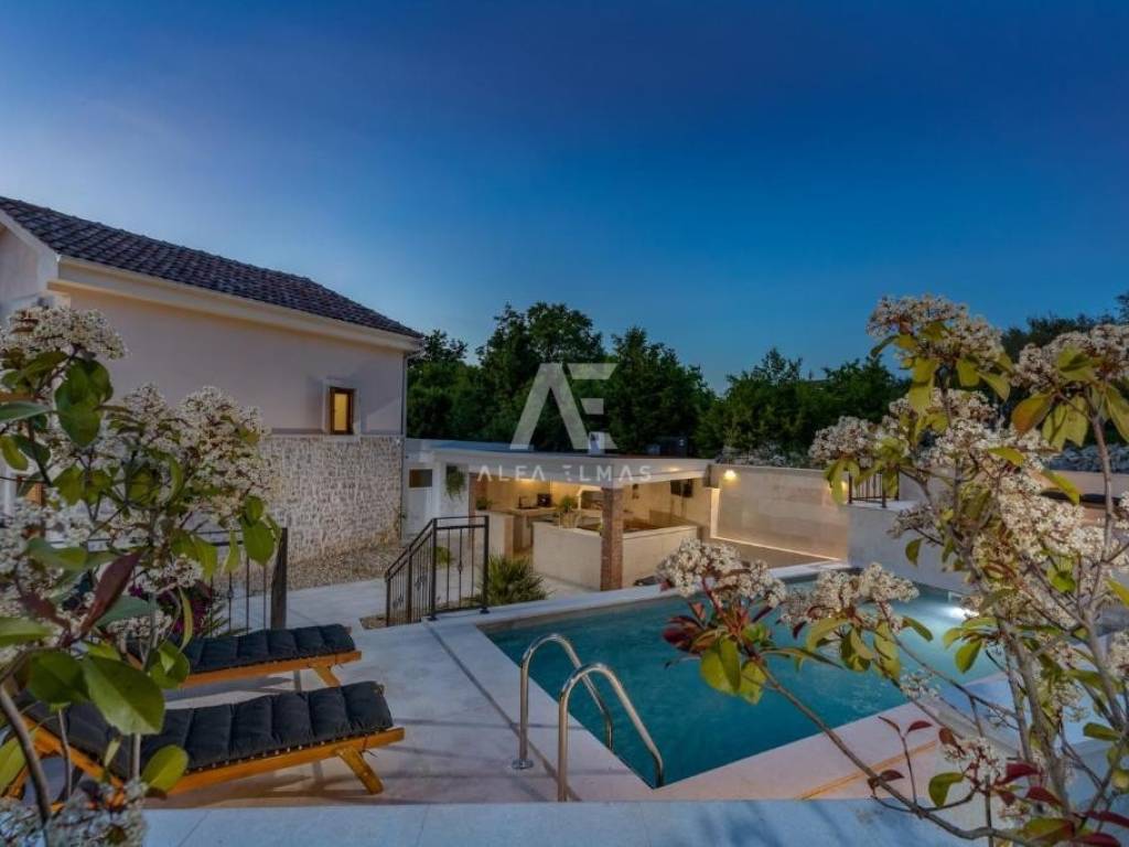 The outdoor area provides a true Mediterranean experience – landscaped and fenced garden, summer kitchen with barbecue, two storage rooms, outdoor WC and shower, two parking spaces, terrace, and garden. Every corner of this villa is designed to provide privacy, comfort, and a space for family and friends to gather.