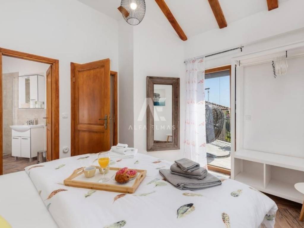 The interior of the villa is carefully designed to combine functionality with luxury. The ground floor features a spacious living room with a modern kitchen and dining area, while the upper floor offers two generous bedrooms, each with its own bathroom and balcony overlooking the beautiful surroundings and the sea. An additional bathroom on the ground floor, air conditioning, and a flat-screen TV with satellite channels ensure comfort and convenience for everyday living.