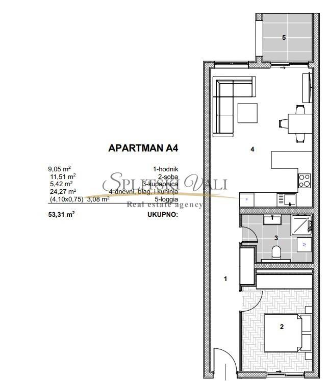 Stan se nalazi u Arbaniji, u novogradnji, te je riječ o jednosobnom stanu smještenom na prvom katu zgrade (oznaka P3-A4). Sastoji se od hodnika, jedne spavaće sobe, kupaonice, kuhinje, blagovaonice i dnevnog boravka s izlazom na lođu površine 4,10 m, a tlocrt je priložen u oglasu. Neto površina stambenog prostora iznosi 50,29 m, dok ukupna bruto površina stana s lođom iznosi 53,31 m.