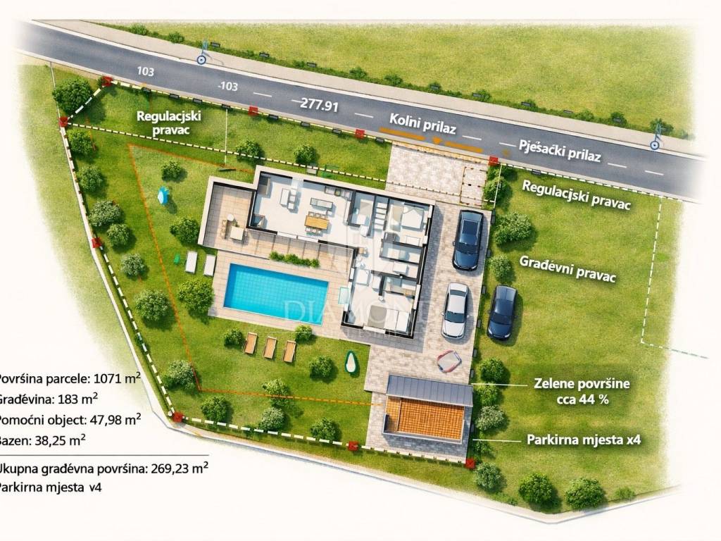 U prodaji je građevinsko zemljište na jugu Istre sa gotovim projektom i pravomoćnom građevinskom dozvolom, što je danas najveća prednost na tržištu jer kupcu štedi mjesece planiranja, usklađivanja i administracije. Parcela ima ukupno 1.071 m², urednog je vlasništva i bez tereta, a projekt je promišljeno postavljen tako da maksimalno koristi teren i pruža osjećaj privatnosti. Prema projektu planirana je kuća modernog koncepta s bazenom, uz jasno definirane gabarite i funkcionalan raspored na parceli. Predviđene dimenzije glavne građevine su 20,08 × 13,33 m, a bazen je dimenzija 8,50 × 4,50 m. Plan uključuje i pomoćnu građevinu, dok zelene površine čine velik dio parcele (oko 44%), što je savršeno za mediteranski vrt, zonu za sunčanje i privatni vanjski prostor. Pristup je osiguran s asfaltirane prometnice, s definiranim kolnim i pješačkim prilazom, što je važan detalj za bezbrižnu gradnju i kasnije korištenje nekretnine.