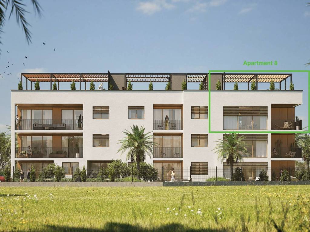 Apartman se nalazi na drugom katu te mu pripada privatna krovna terasa, koja pruža dodatni prostor za opuštanje, druženja i stvaranje vlastite mediteranske oaze.