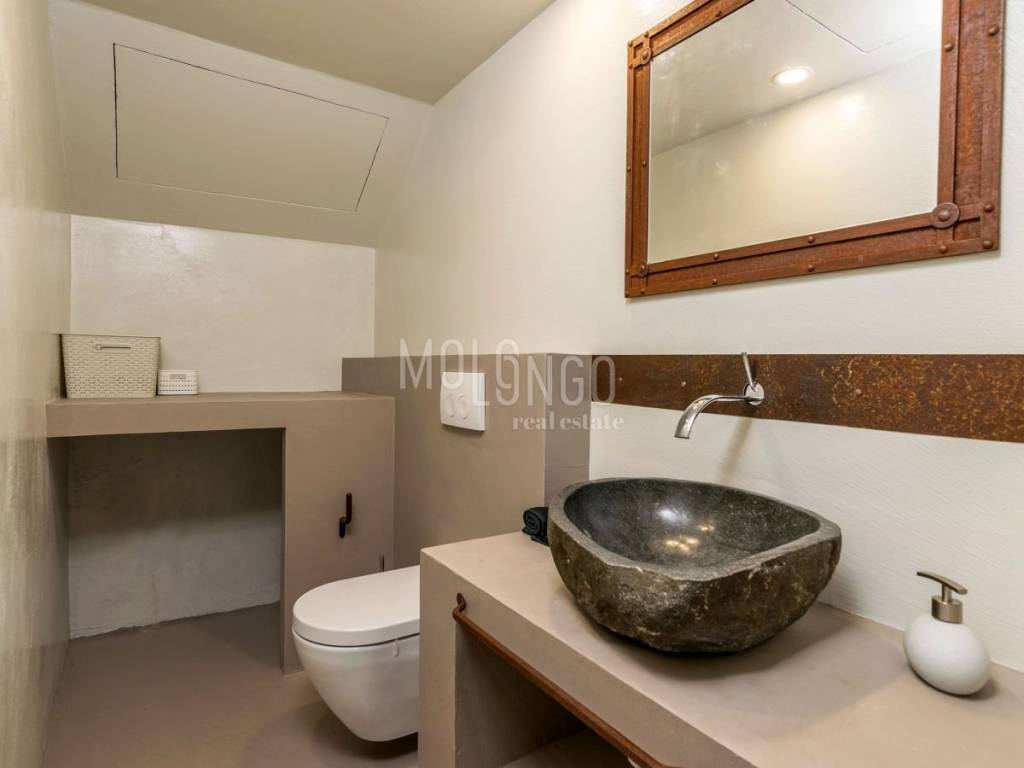 During the reconstruction, Istrian stone and new technologies were used. All surfaces in the house and the pool are made with the Beton Cire spatolato technique. The materials used are Porobeton Ytong and Cor-Ten, and all built-in elements and cabinets made of oak wood are made to measure. Underfloor heating, air conditioning and a fireplace are installed.