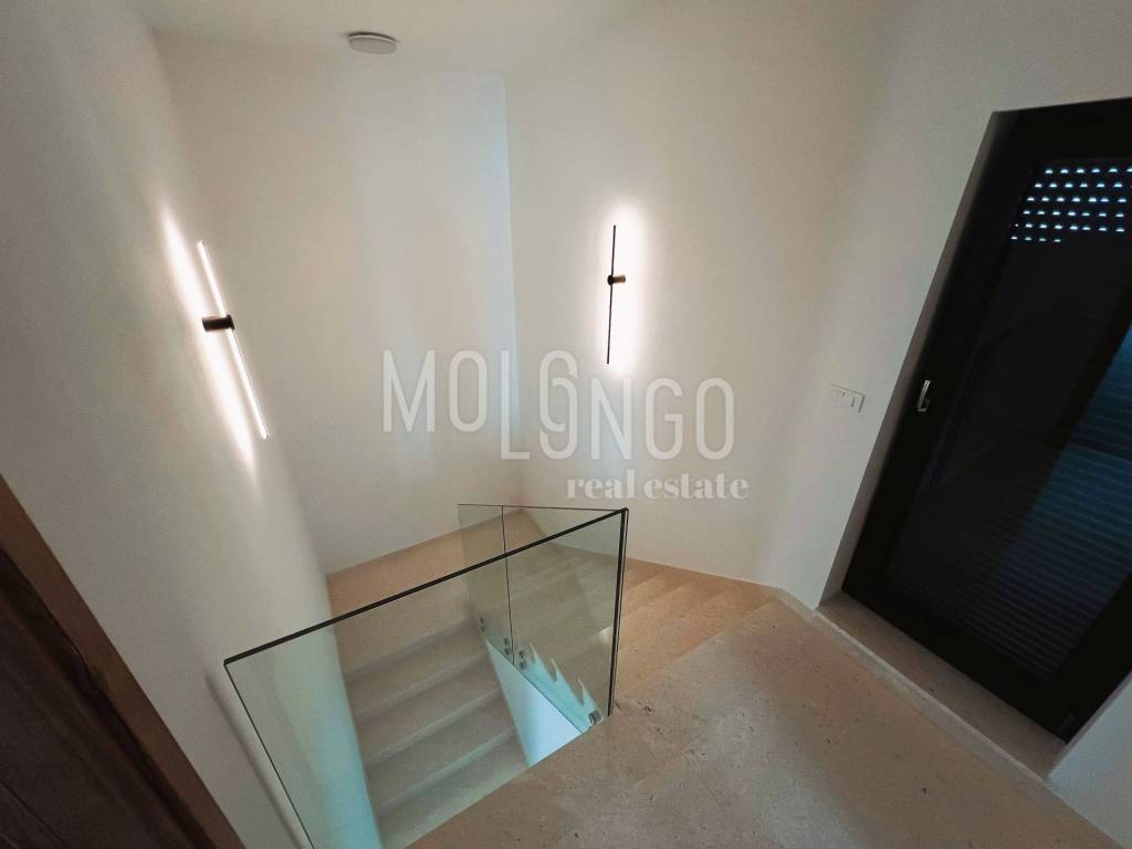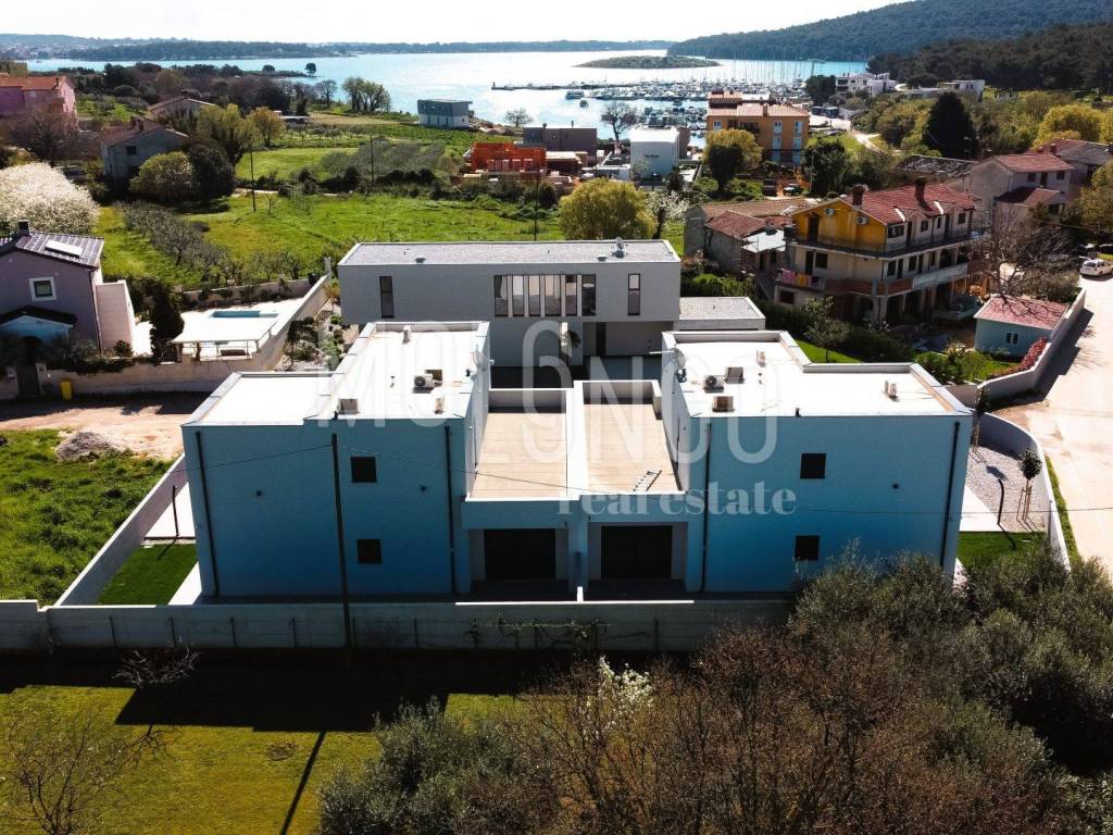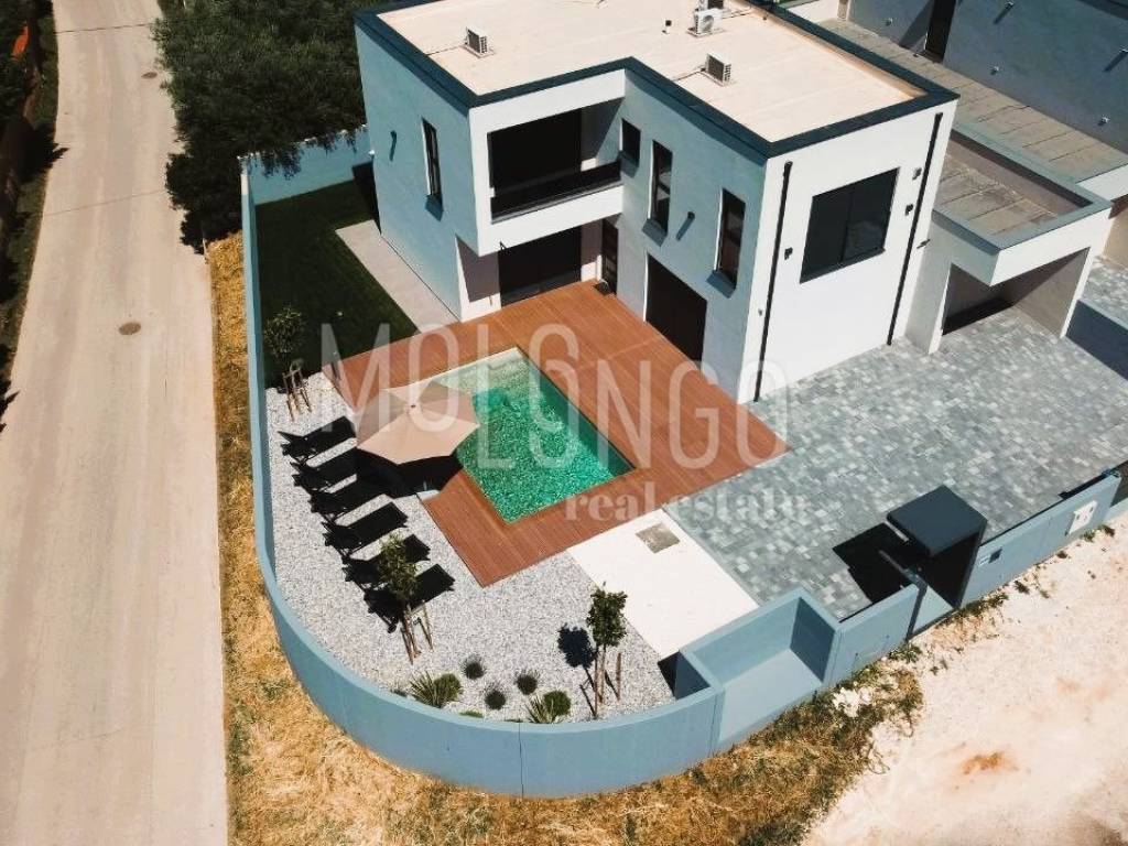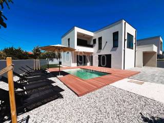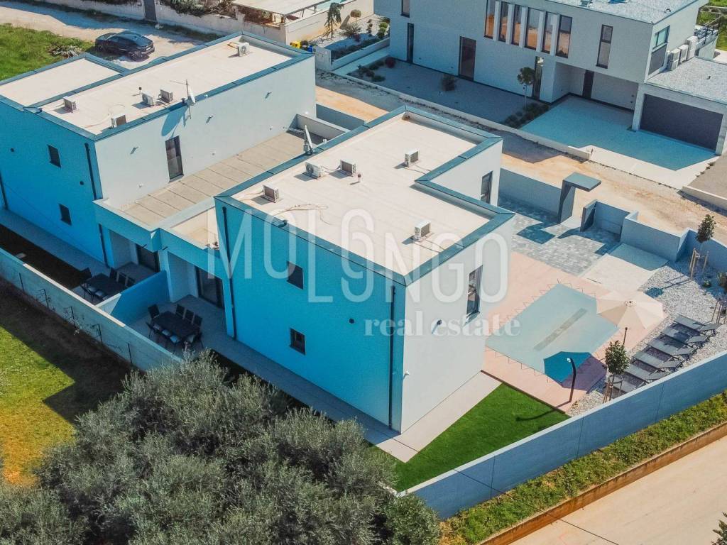 This modern semi-detached villa with a swimming pool is located in a quiet place near Medulin, just 200 meters from the sea. Quality built, the house covers a total net area of ​​188.19 m2, distributed over the ground floor and first floor.